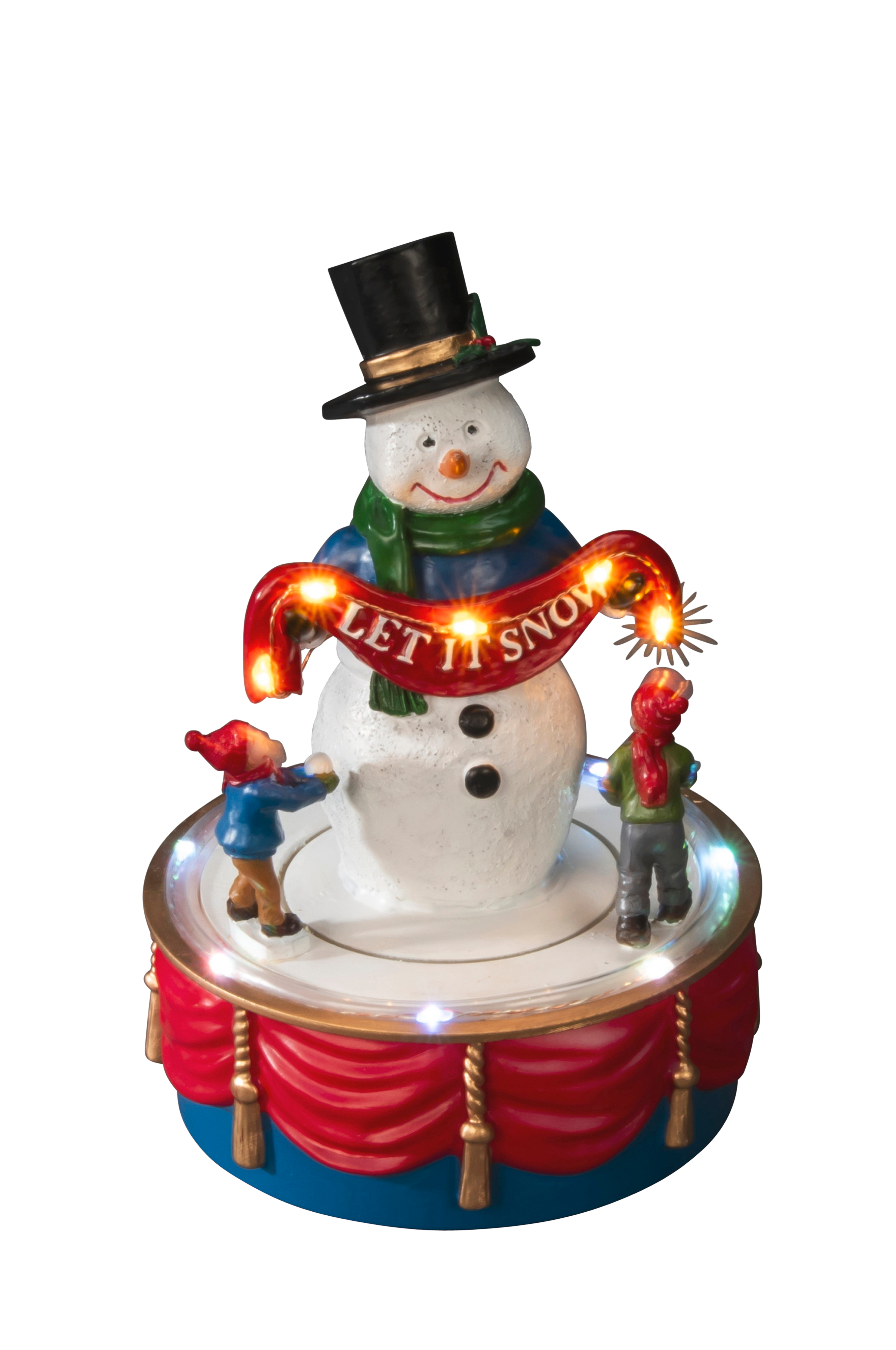 Snømann med roterende barn. Dekorasjonen kan brukes med konstant lys, bevegelse og musikk, eller med en 6-timers timer, hvoretter produktet slås av i 18 timer for så å lyse opp igjen neste dag for ekstra festlig stemning. Karusellen har en 6-timers timer, drives av 3xaa-batterier (ikke inkludert), og kan også brukes med den medfølgende usb-kabelen. Bredden er 18,2 cm og høyden er 23,5 cm.