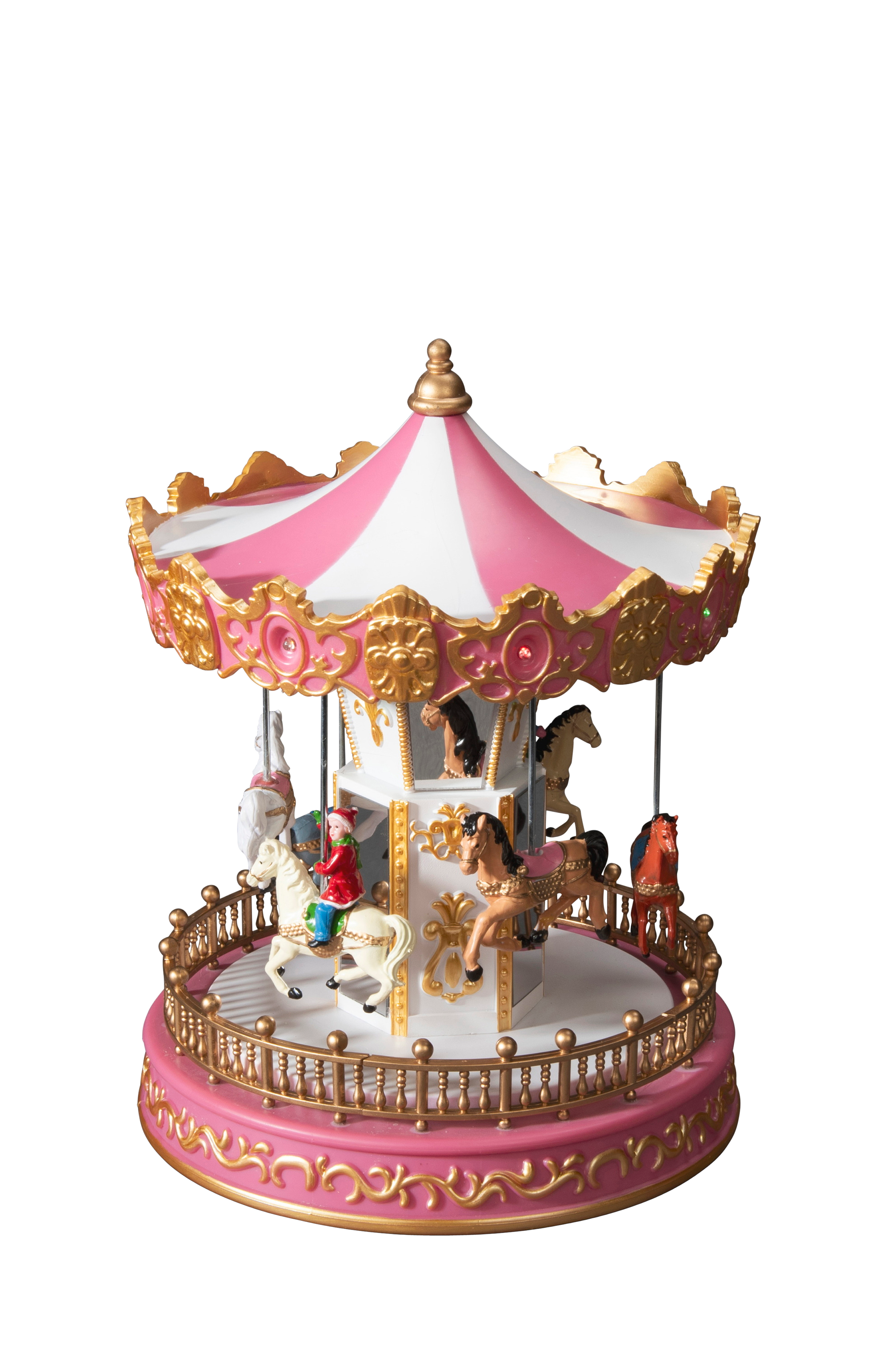 Pynt opp med denne karusellen med 14 faste og blinkende LED-lys og musikk for ekstra festlig stemning. Karusellen har en 6-timers timer, drives av 3xaa-batterier (ikke inkludert) og kan også brukes med den medfølgende usb-kabelen. Bredden er 18,2 cm og høyden er 23,5 cm.