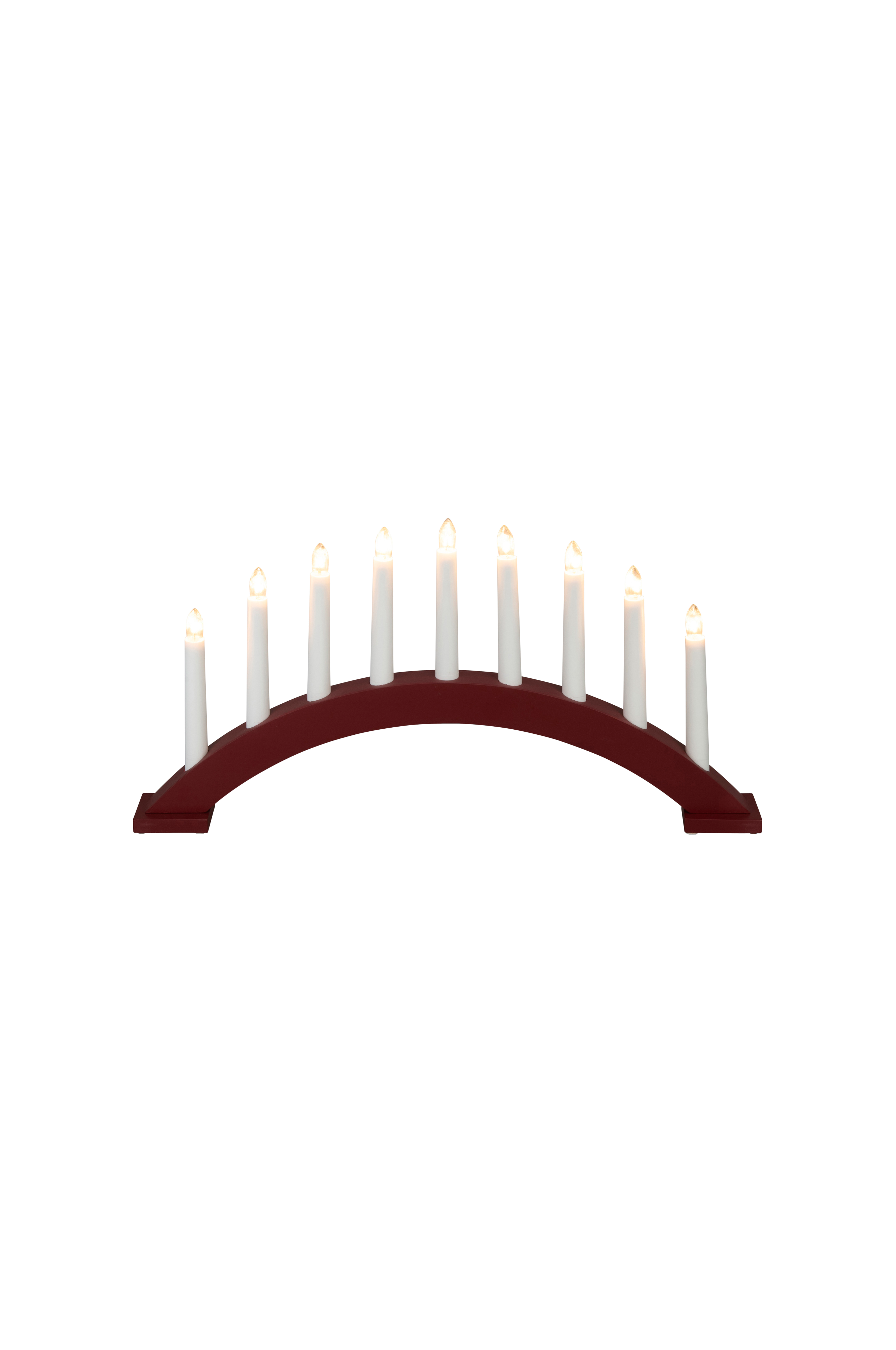En 9-armet lysestake i matt hvitlakkert tre med varmhvite lysdioder, 1,7 m hvit kabel og bryter. Lysestaken er bueformet, 25,5 cm høy og 49 cm bred.