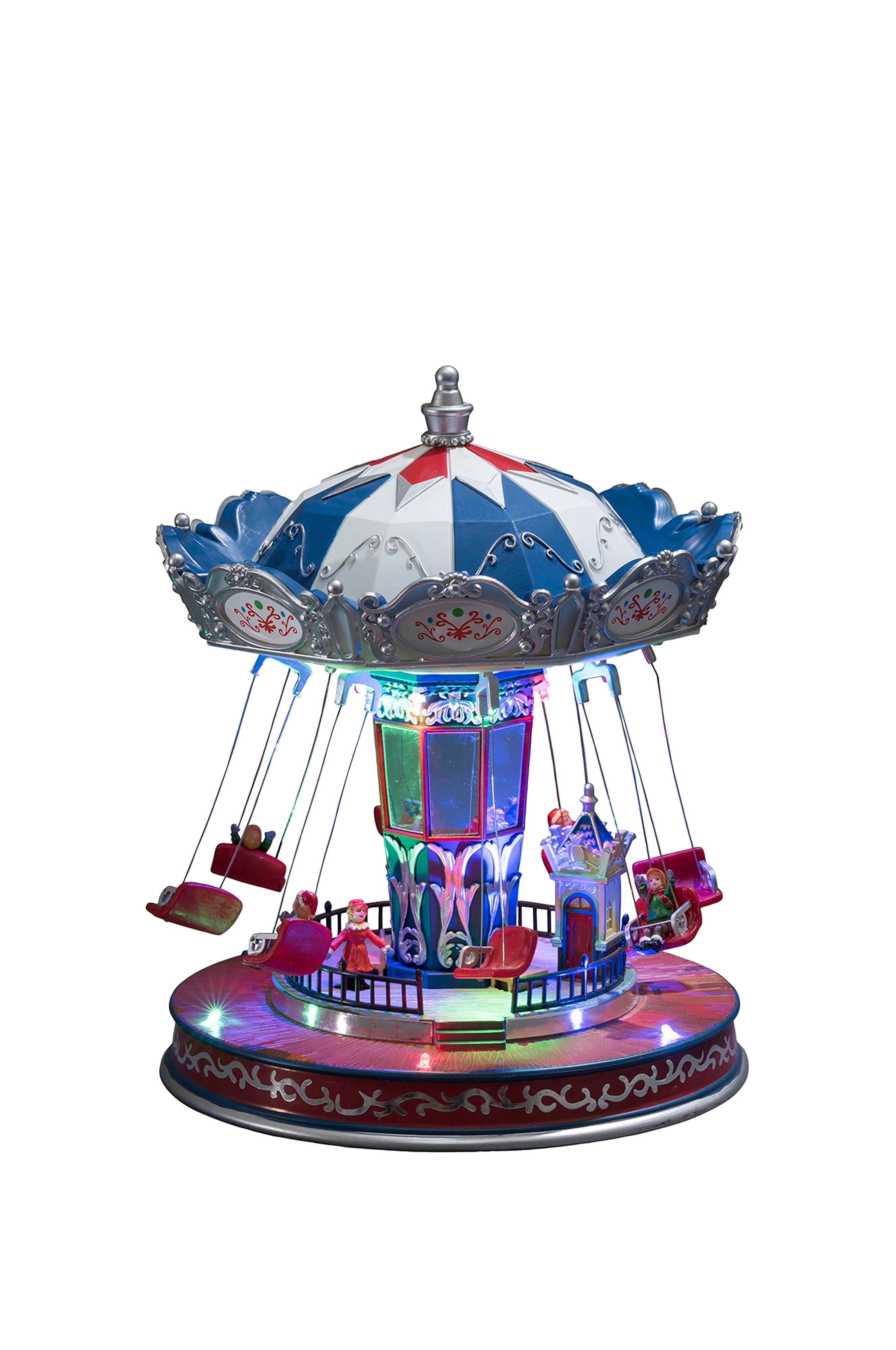 Magisk snurrende karusell med festlig stemning og 12 flerfargede lysdioder. Høyde 26,5 cm, bredde 21 cm. Drives av en 4,5 V transformator eller 3 aa-batterier (ikke inkludert). Kun til innendørs bruk.