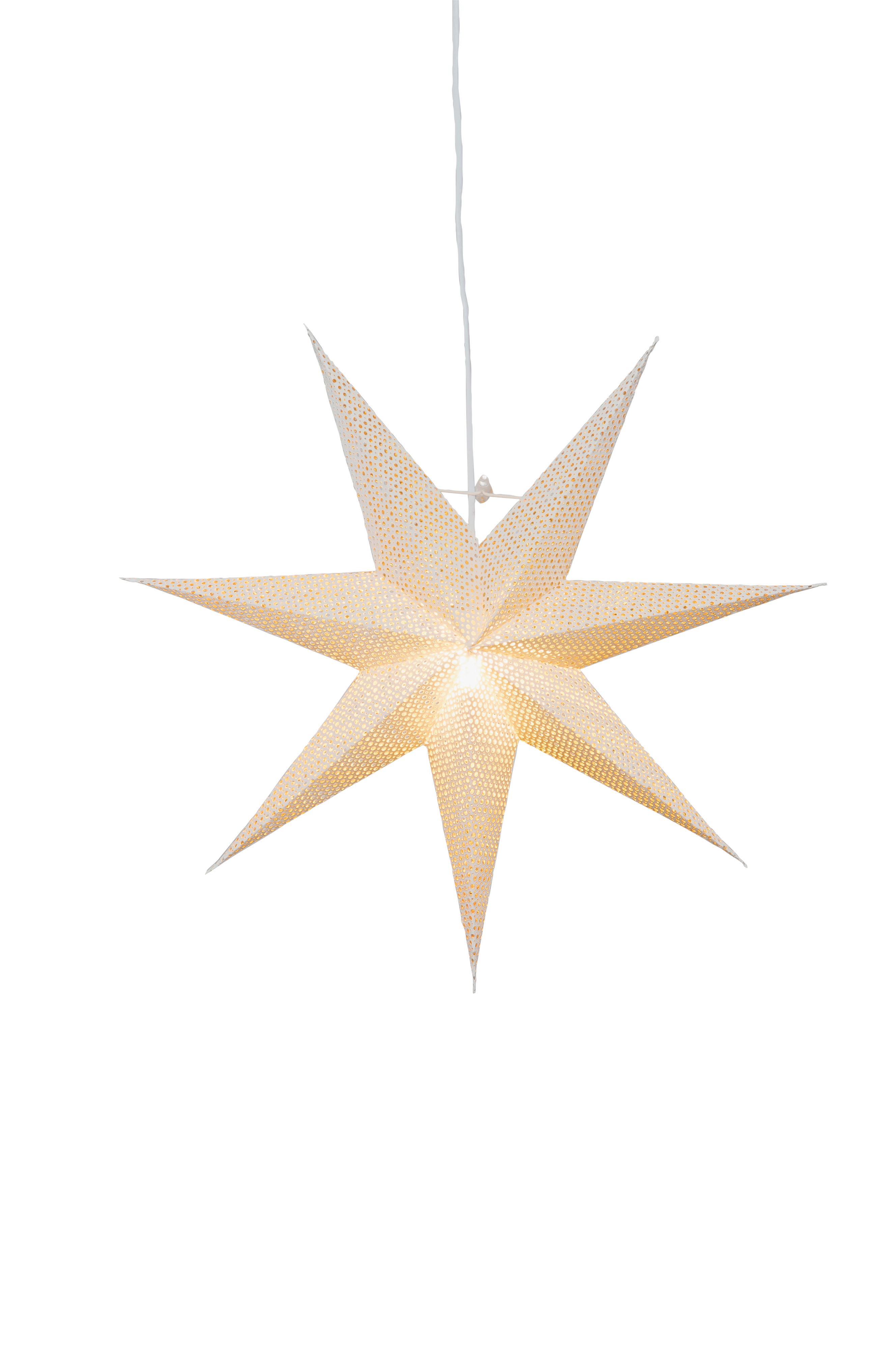 Vakker hvit og messingfarget papirstjerne som skaper en koselig atmosfære i rommet. Stjernen er 60 cm lang, inkludert en hvit kabel med bryter. E14-sokkel (lyskilde ikke inkludert). Kun til innendørs bruk.