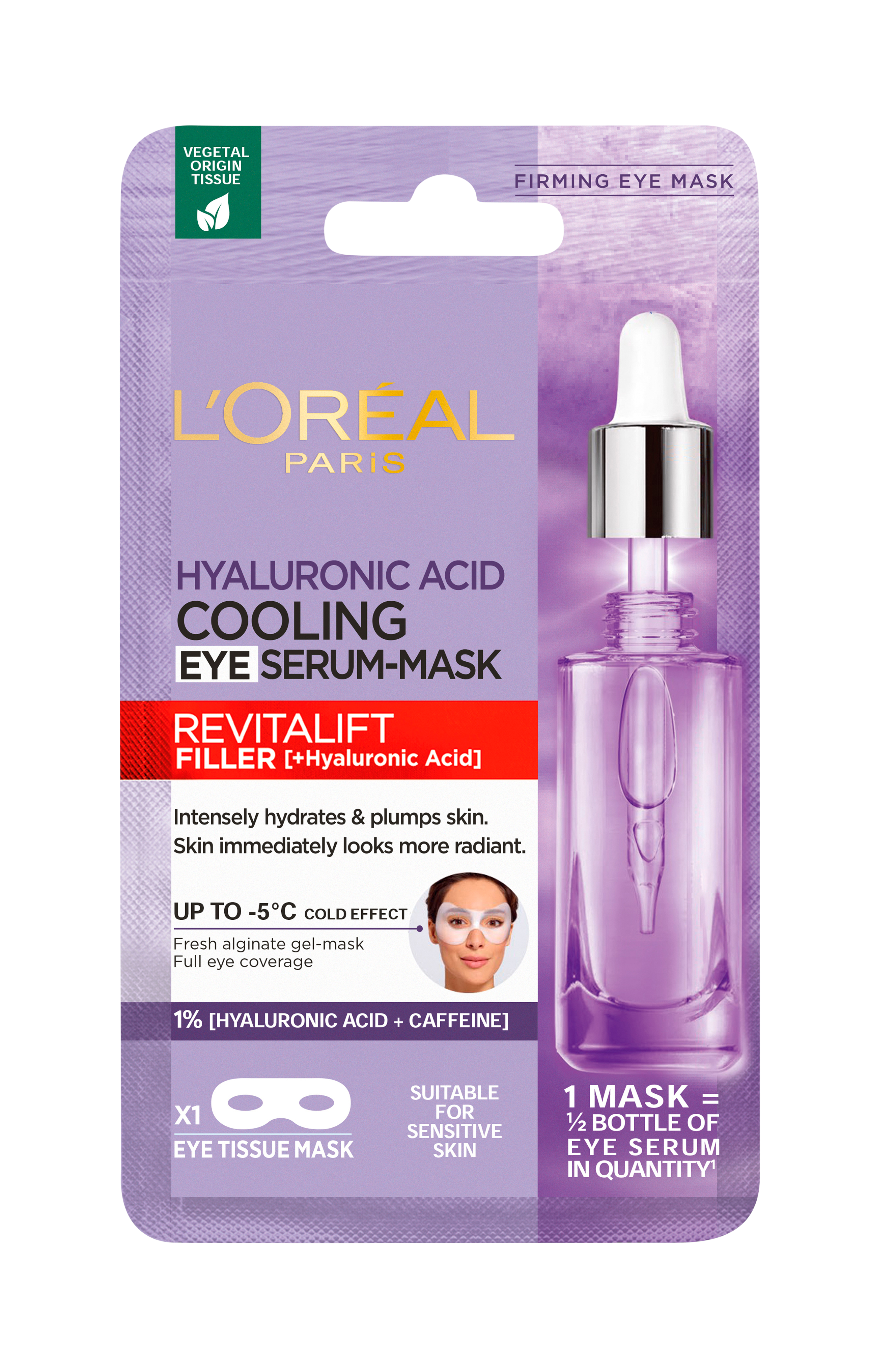 L'Oréal Paris Revitalift Filler Hyaluronic Acid Cooling Eye Serum-mask er en avkjølende gelemaske for øyeområdet beriket med hyaluronsyre og koffein. Den inneholder samme formelmengde som i en halv flaske serum.* Formelen er beriket med hyaluronsyre, som tilfører intensiv fukt og fyller huden med fukt, samt koffein som revitaliserer huden og booster øyekonturen. Banebrytende fibervev med algefiber skaper en fresh gelelignende konsistens, og formelen gir umiddelbart en -5 °C avkjølende effekt og nytt liv til øynene. Gelemasken dekker hele øyeområdet. Passer for sensitiv hud.