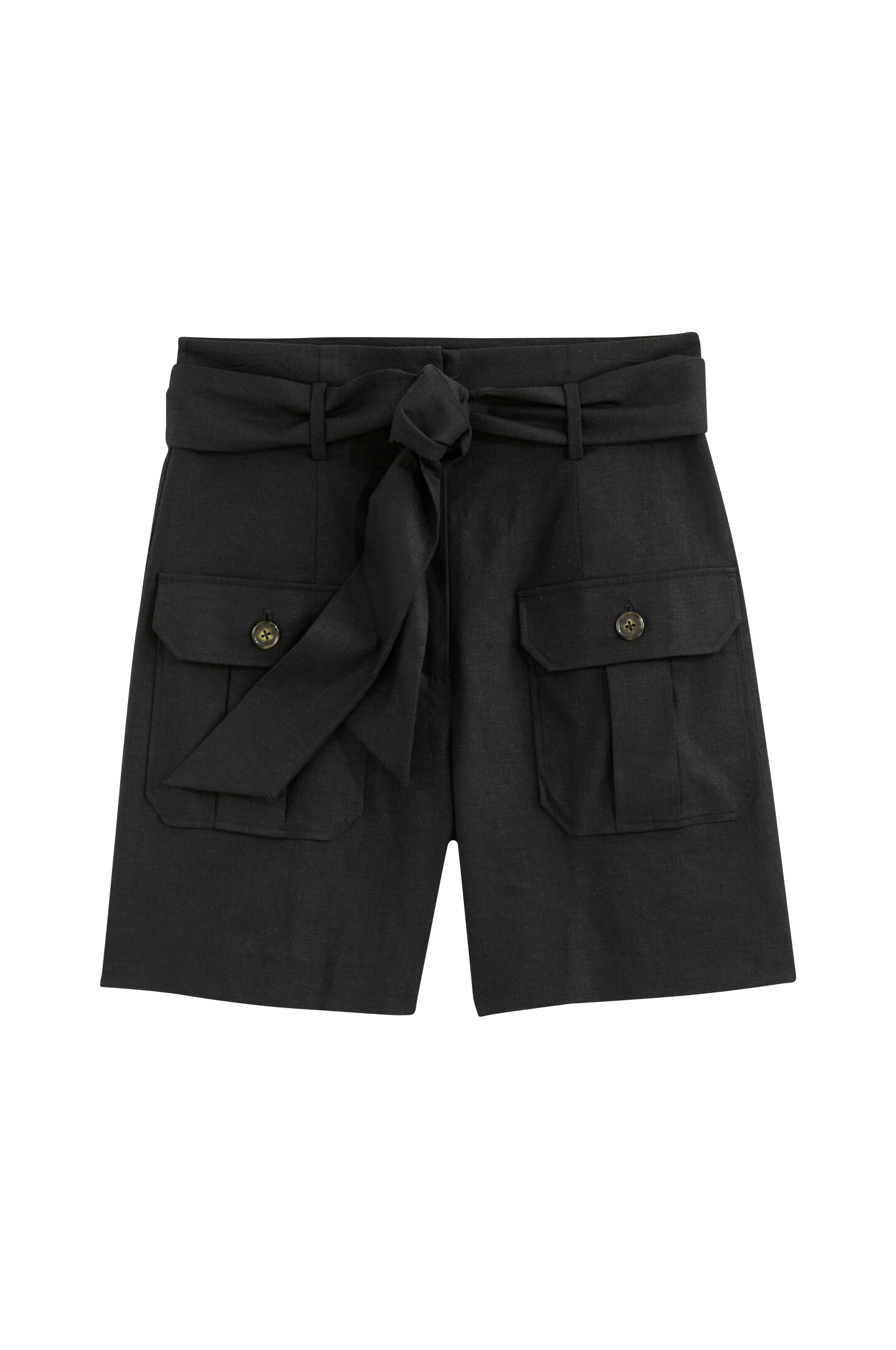 Shorts i moderne paperbag-modell. Høy midje og knytebelte. Detaljer - Høy midje Materiale og vedlikeholdsråd - 54% lin, 44% viskose, 2% elastan - Maskinvask 30° - Strykes på medium temperatur / tåler ikke blekemiddel - Tåler ikke tørketromling - Tåler ikke rens Finnes i store størrelser Ytterligere informasjon - Avtagbart knytebelte i hemper - 2 baklommer med klaff og knapp i hornimitasjon foran - Indre benlengde 18 cm i størrelse 48