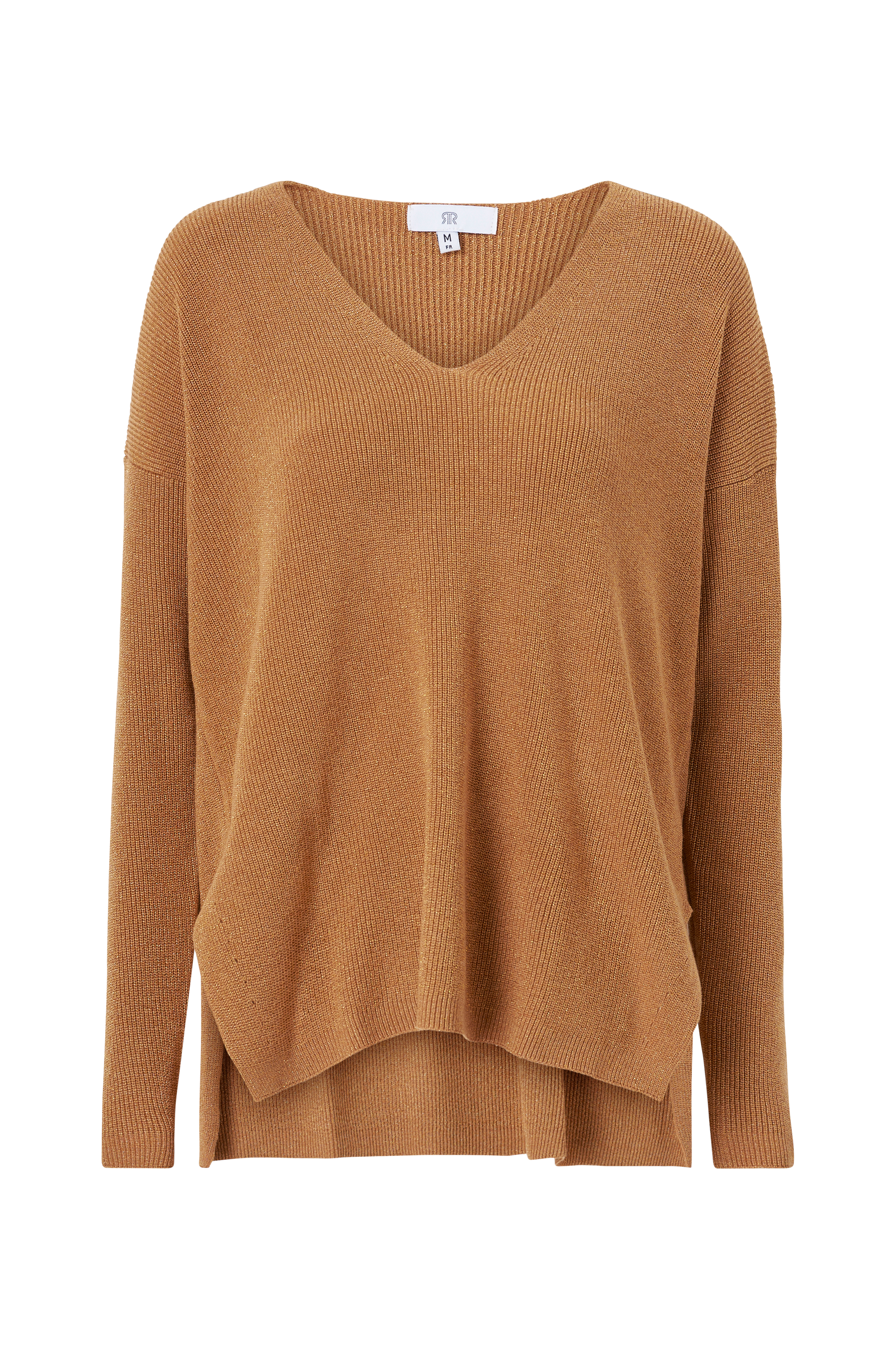 Lang genser i lett skimrende materiale, med fin V-utringning. Behagelig modell med ledig passform.