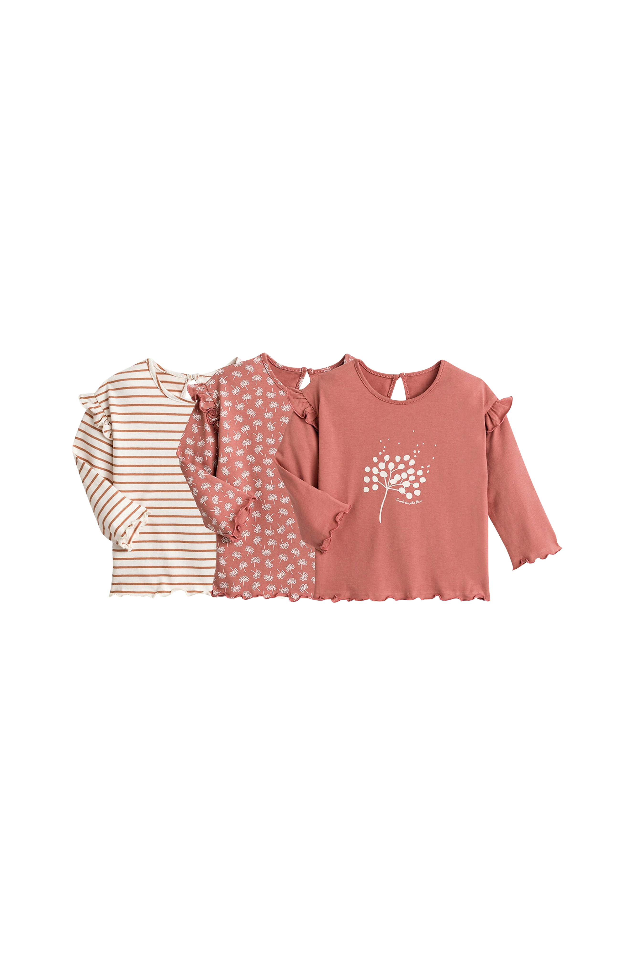 Detaljer - Lange ermer - Rund hals - Trykt mønster - Påsydd volang på ermene - Dråpeformet splitt med knapp bak - Dekorsømmer - Selges i 3-pk: 1 ensfarget med motiv foran + 1 mønstrete + 1 stripete Materiale og vedlikeholdsråd - 100% bomull - Maskinvask 40° - Strykes på medium temperatur / tåler ikke blekemiddel - Tørketromling på lav temperatur - Tåler ikke rens Ansvarlig produkt - Velg miljøvennlig bomull for ansvarlig forbruk. Hvorfor? Fordi den utelukker skadelige kjemikalier, insektmidler, plantevernmidler og GMO. Resultatet: en produksjon med redusert påvirkning av det biologiske mangfoldet og bøndenes helse. Smart. - Velg et produkt med Øko-Tex®-merking STANDARD 100, og du får et tekstilprodukt som ikke er skadelig eller irriterer huden. En internasjonal og uavhengig merking som beskytter forbrukernes helse. Den er både sunn og bærekraftig.