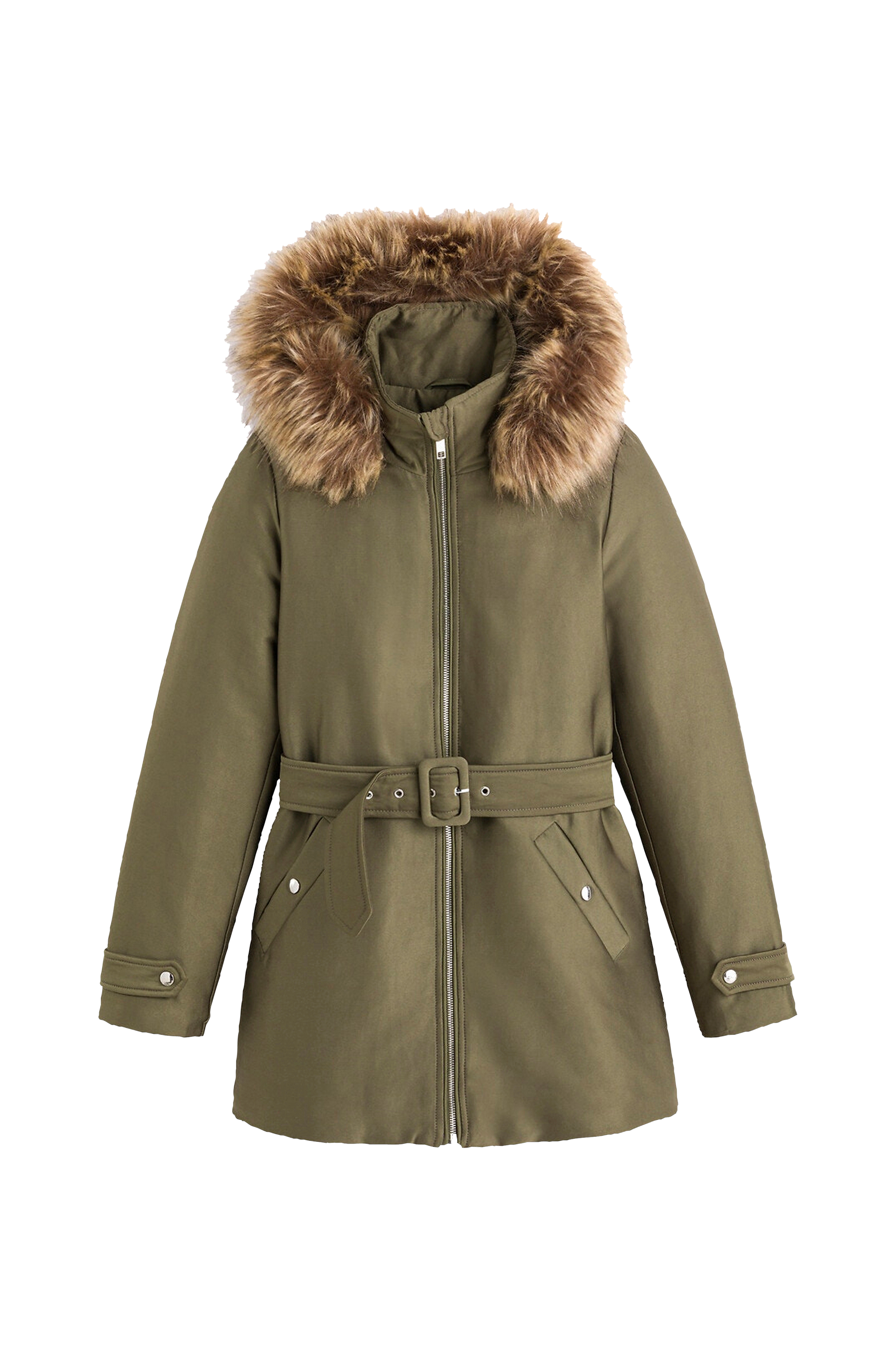 Militærinspirert parkas i flatterende lengde, med vakre detaljer som herlig hette med kant i fuskepels og belte som markerer midjen.