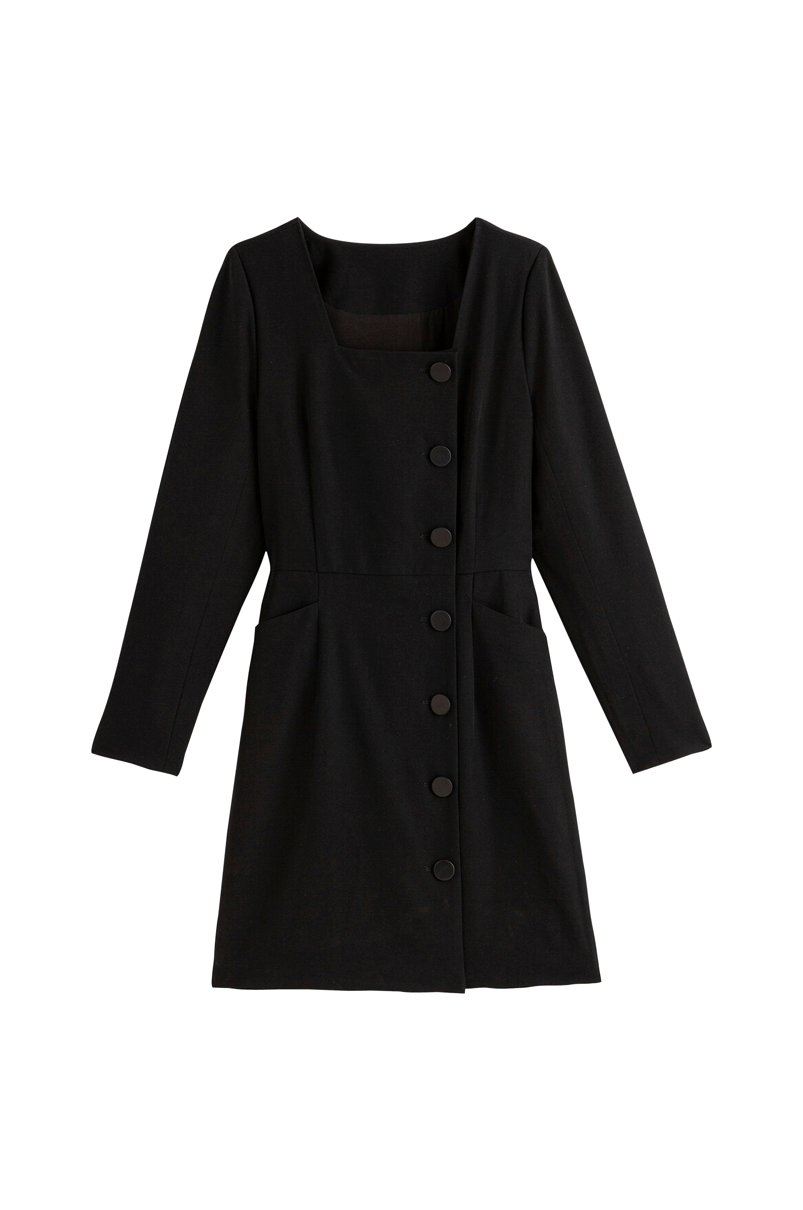 Original kjole med kantet hals og asymmetrisk knapping. Stilig versjon av ‘den lille sorte'. Detaljer - Figurnær modell - Kort modell - Lange ermer - Kantete halsringning - Sidelommer - Lengde 90 cm i størrelse 38 Materialer og vedlikeholdsråd - Hovedmateriale: 77% polyester, 18% viskose, 5% elastan - Fôr: 100% viskose - Finvask 30° - Strykes på lav temperatur / tåler ikke blekemiddel - Tåler ikke tørketromling - Renses med skåneprogram