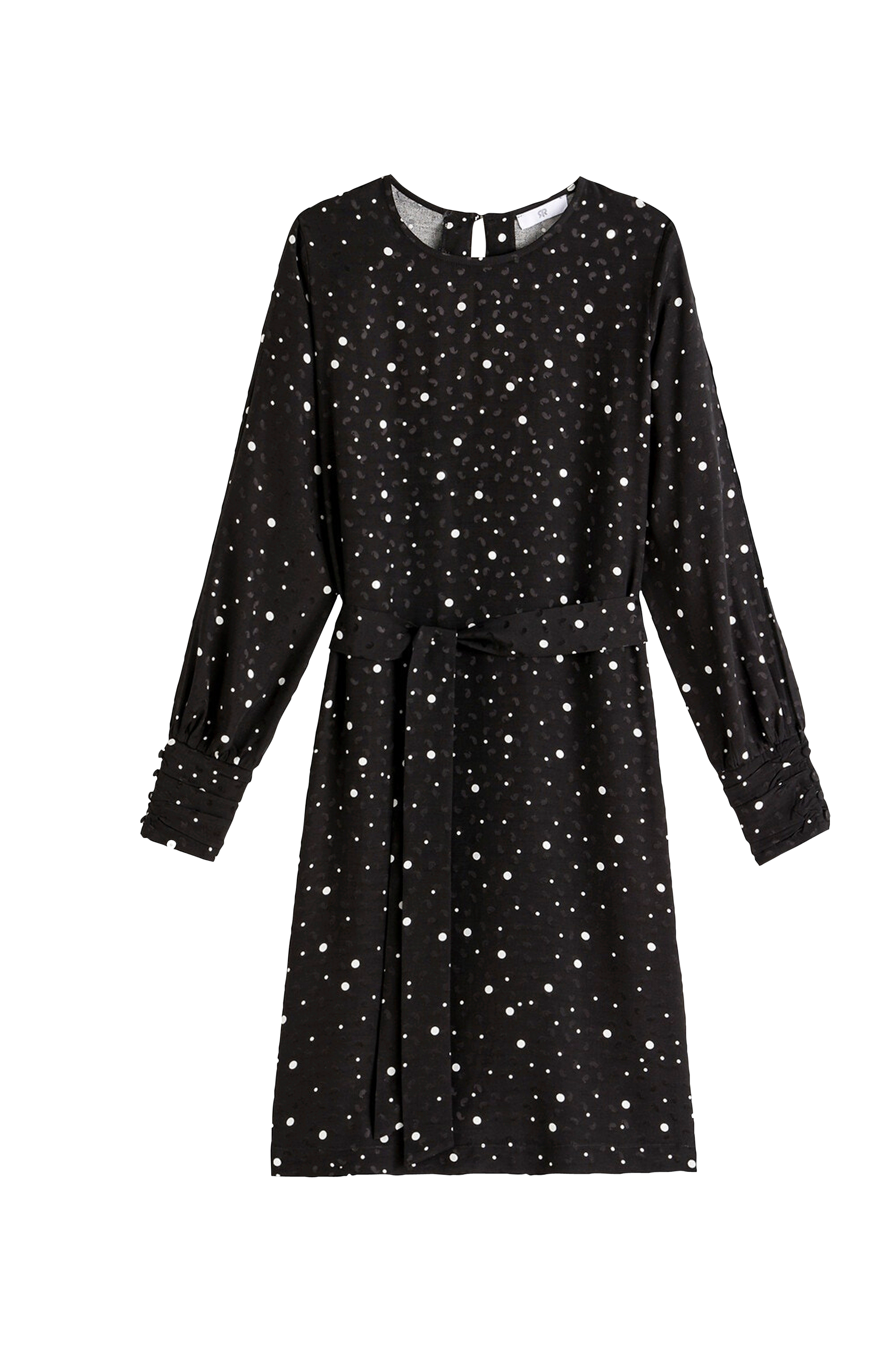 Kjole med vakre detaljer. Mykt materiale med satengfølelse, puffermer med splitt, og rynker som markerer midjen og gir en flatterende passform. Detaljer - Rett modell - Kort modell - Lange ermer med splitt og mansjett med knapper - Rund hals og dråpeformet splitt med knapp bak - Avtagbart belte - Prikkete mønster - Lengde 92 cm i størrelse 38 Materiale og vedlikeholdsråd - 100% viskose - Vedlikeholdsråd står på instruksjonene i plagget