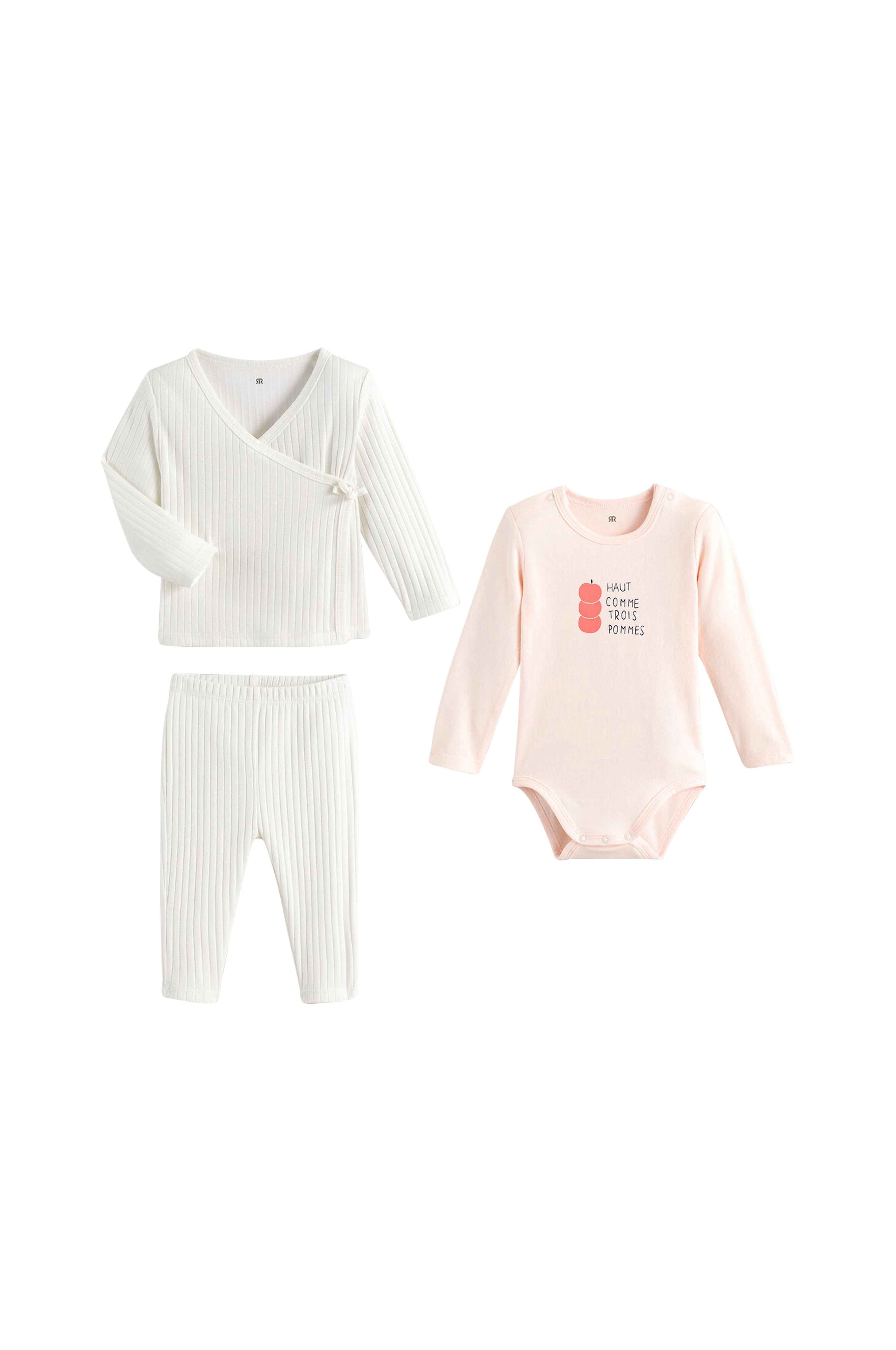 Sett i tre deler med cardigan og bukse i ribbestrikket materiale, og body med lange ermer.