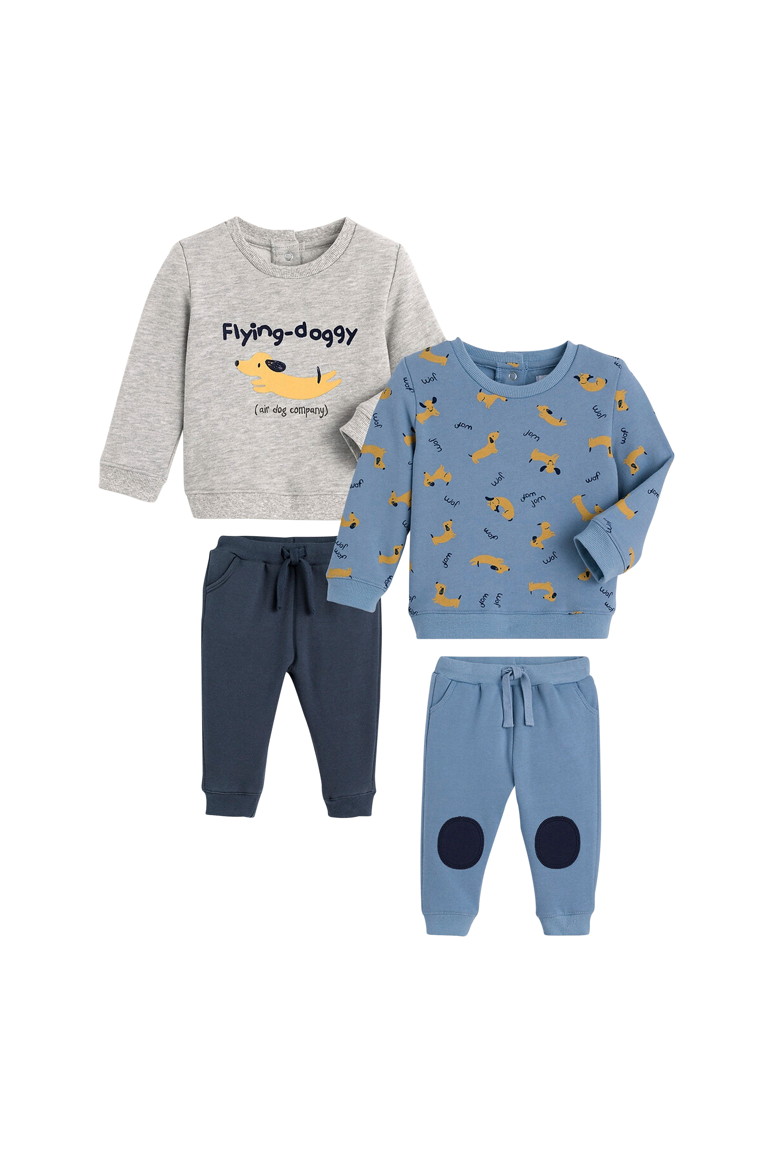 To matchende sett i mykt og varmt sweatshirtmateriale. Hvert sett består av en genser med rund hals og en bukse.