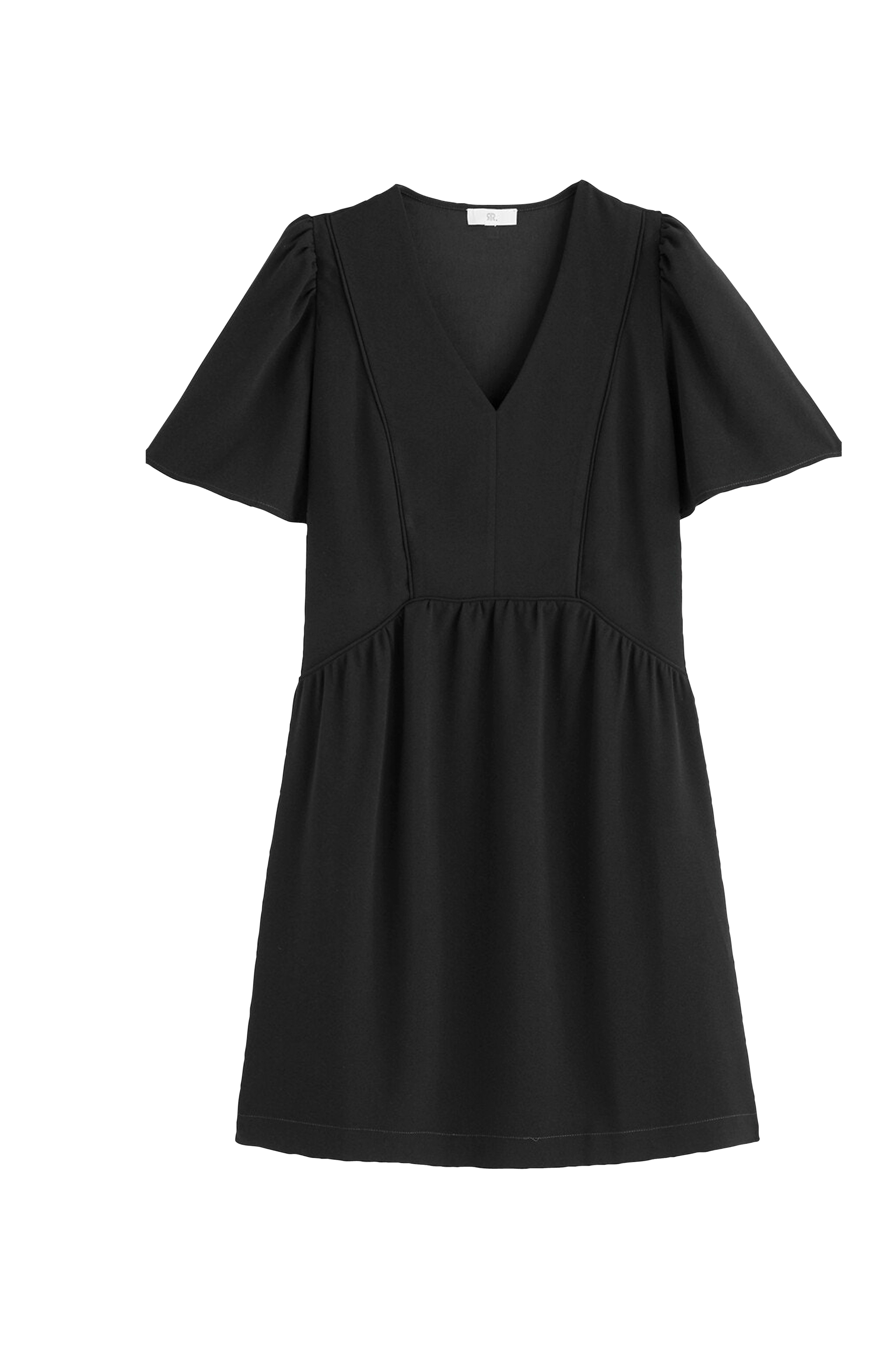 Kjole i stilig modell. Detaljer - Utsvingt modell - Kort modell - Korte ermer - V-utringning - Lengde 90 cm i størrelse 38 Materiale og vedlikeholdsråd - 100% polyester - Maskinvask 30° - Strykes på lav temperatur / tåler ikke blekemiddel - Tåler ikke tørketromling - Tåler ikke rens Ansvarlig produkt - tenk på miljøet og velg gjenvunnet polyester. Av to grunner: 1/ Jo mer vi gjenvinner, desto mindre råmateriale og ressurser blir brukt. 2/ Vi reduserer avfall ettersom det forvandles til nye materialer. Det skaper en god syklus.
