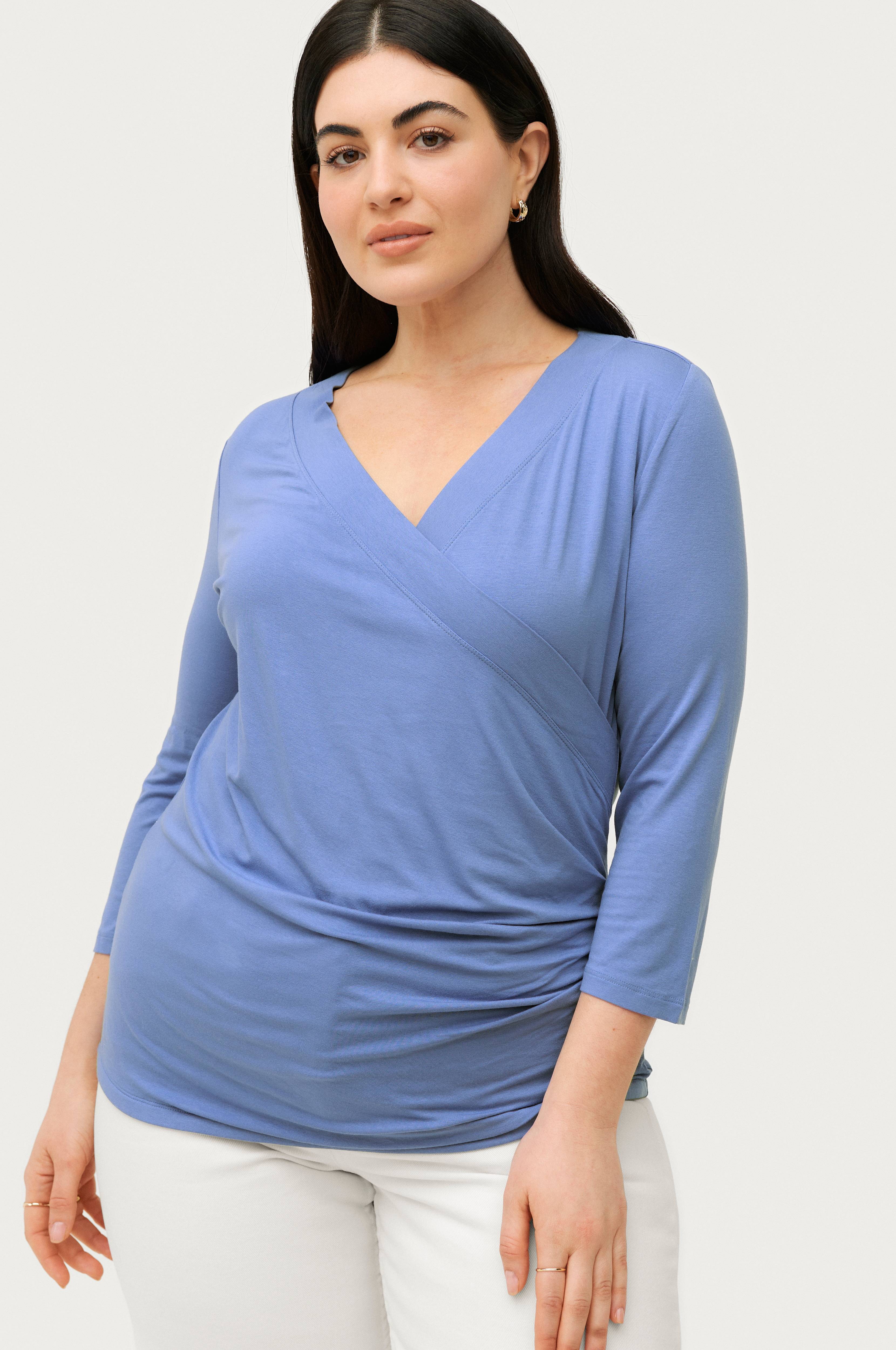 Omslagsmodell med lagte draperingslegg i den ene siden og rette, 3/4-lange ermer.