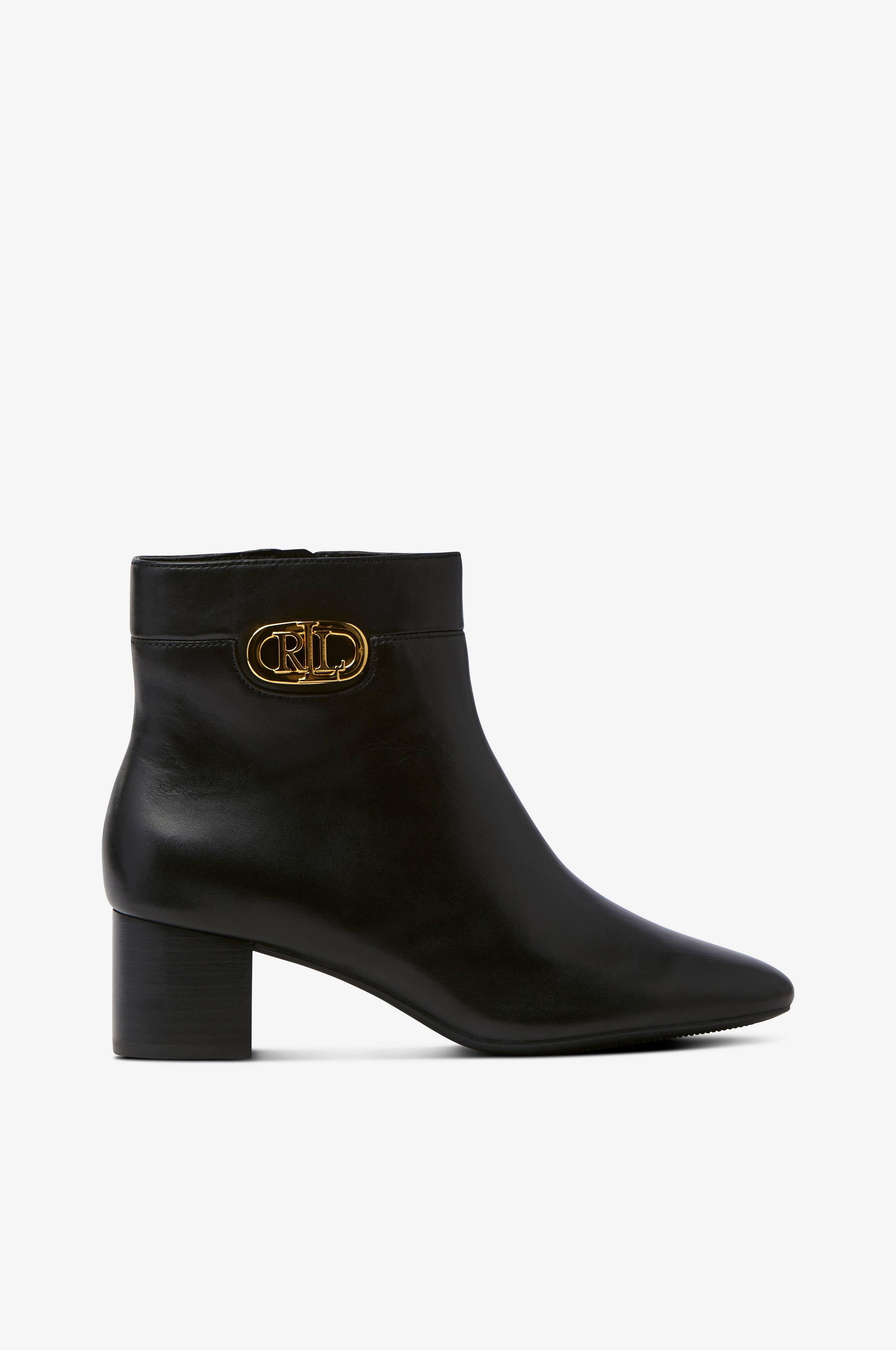 Boots i skinn med lett avrundet tå. Glidelås på innsiden av skaftet og gullfarget dekor på utsiden.