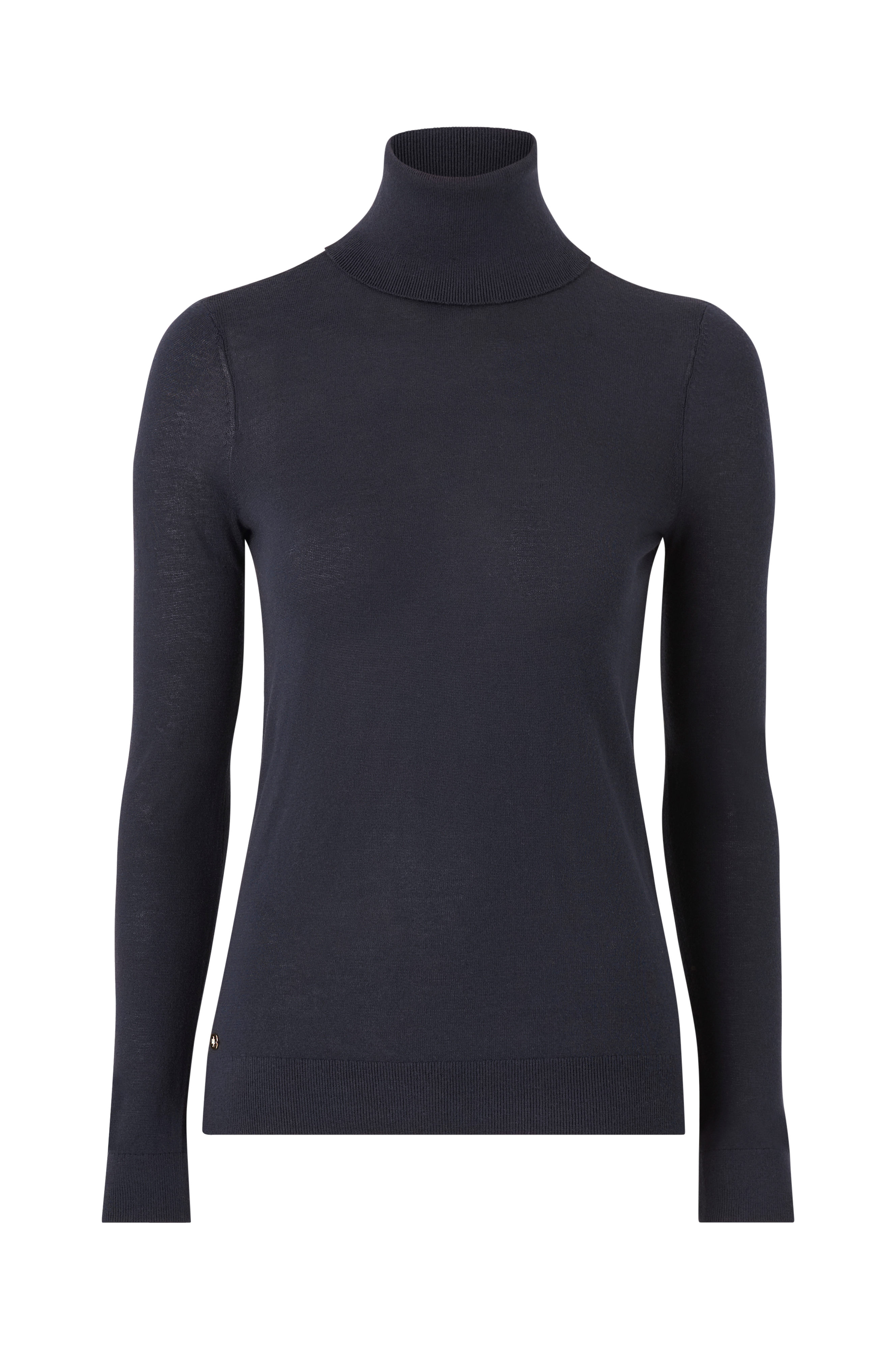 Finstrikket genser i svært myk kvalitet med modal og silke. Høy, ribbestrikket polokrage. Vrangbord i erme- og nederkant.