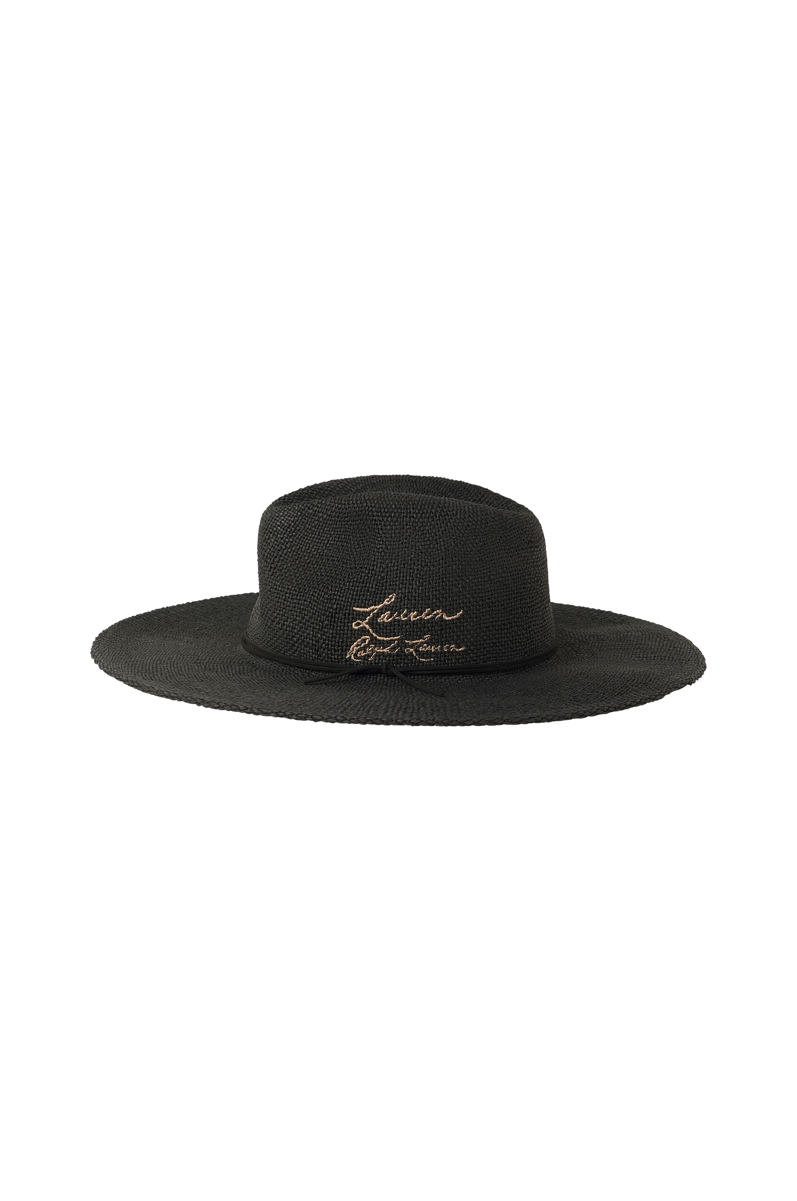 Fedorahatt av papirstrå med brodert logo på siden. Smalt bånd i skinnimitasjon. Svettebånd av tekstil. Bremmens bredde 10 cm.