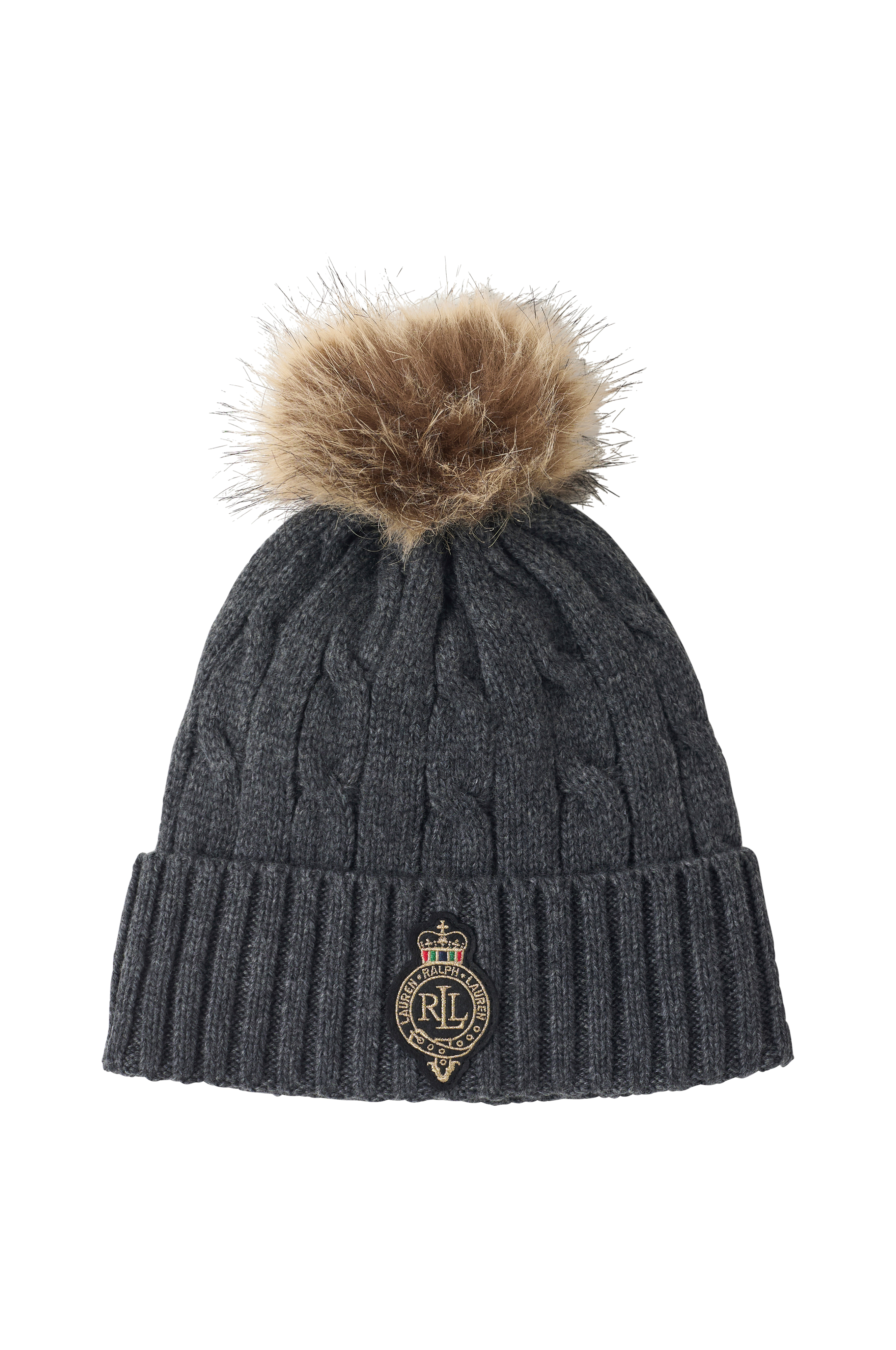 • Kabelstrikket lue i ullmiks med pompong i kunstig skinn• Ribbestrikket, oppbrettet hem med logomerke