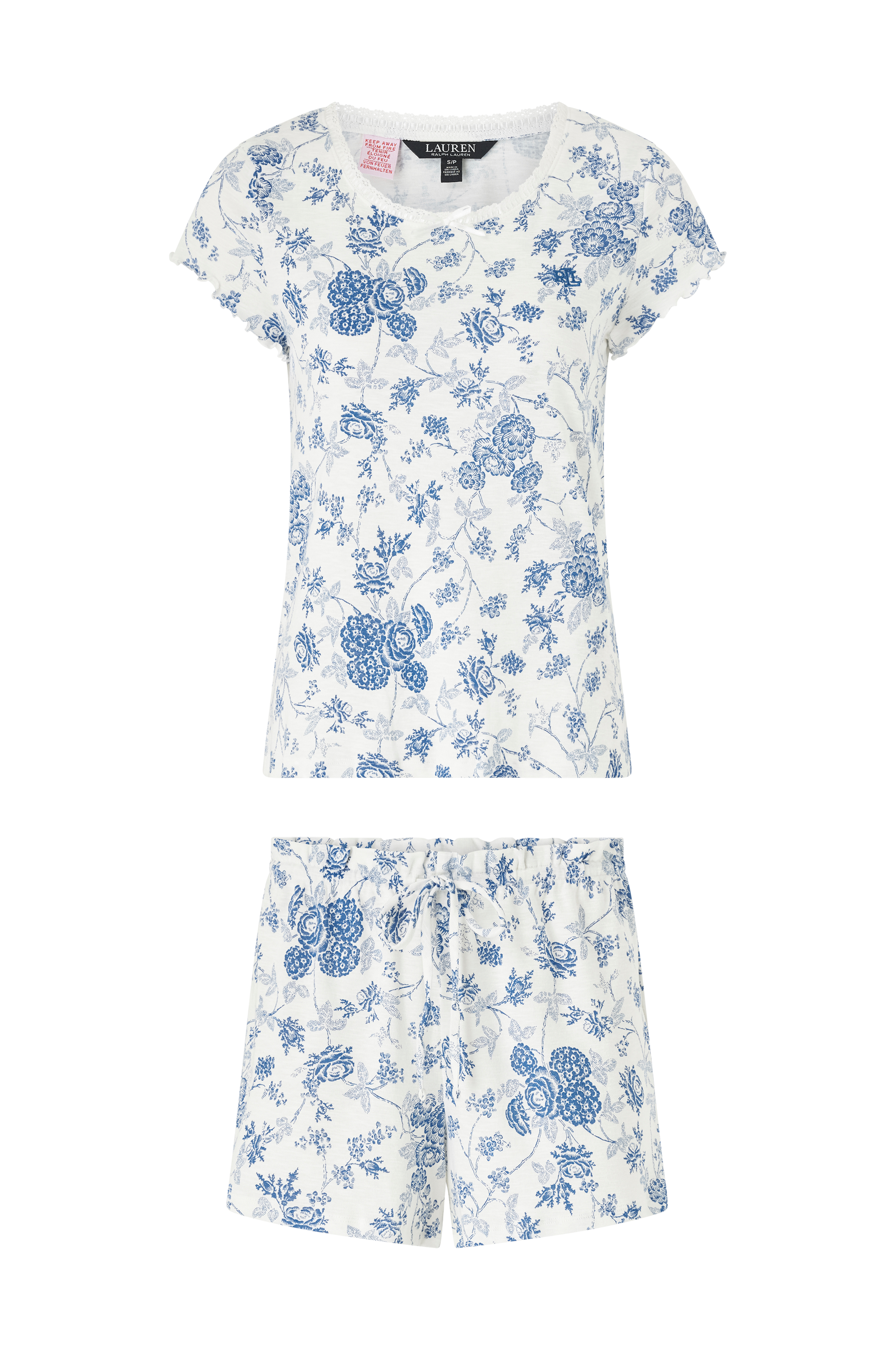 • 2-delt pysjsett i bomullsblanding med trykket mønster• Kortermet topp• Rund hals med blondekant og påsydd bånd foran• Bølgede kanter i ermeslutten• Pyjamasshorts med elastisk midje og snøring