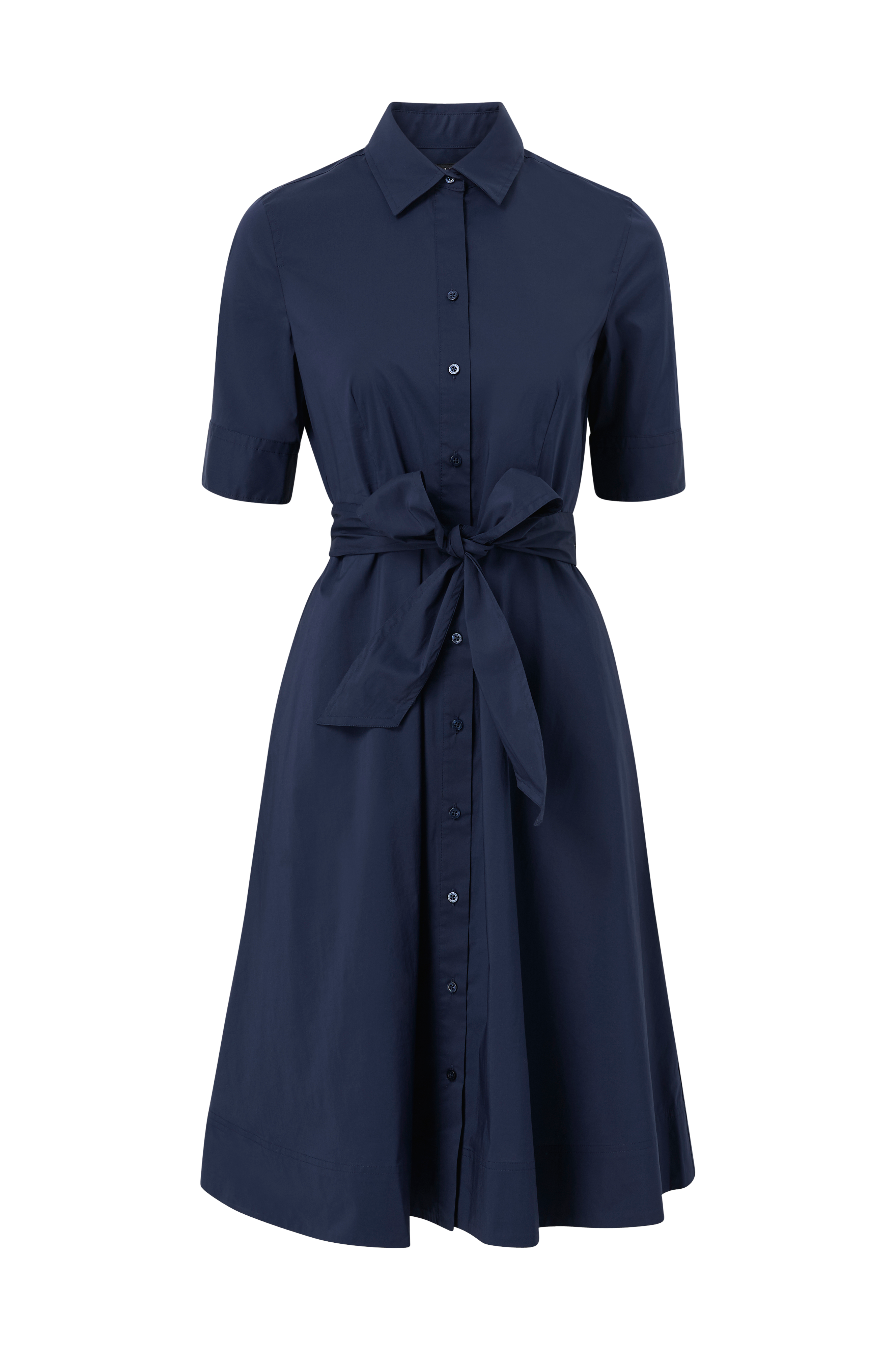 Figurformet modell med avskjæring og knytebelte i midjen, og vidde i skjørtet med innfelt lomme i sidene. Liten krage, knapping helt ned foran samt korte ermer med bred mansjett i ermekantene. Lengde ca. 108 cm i str 36.