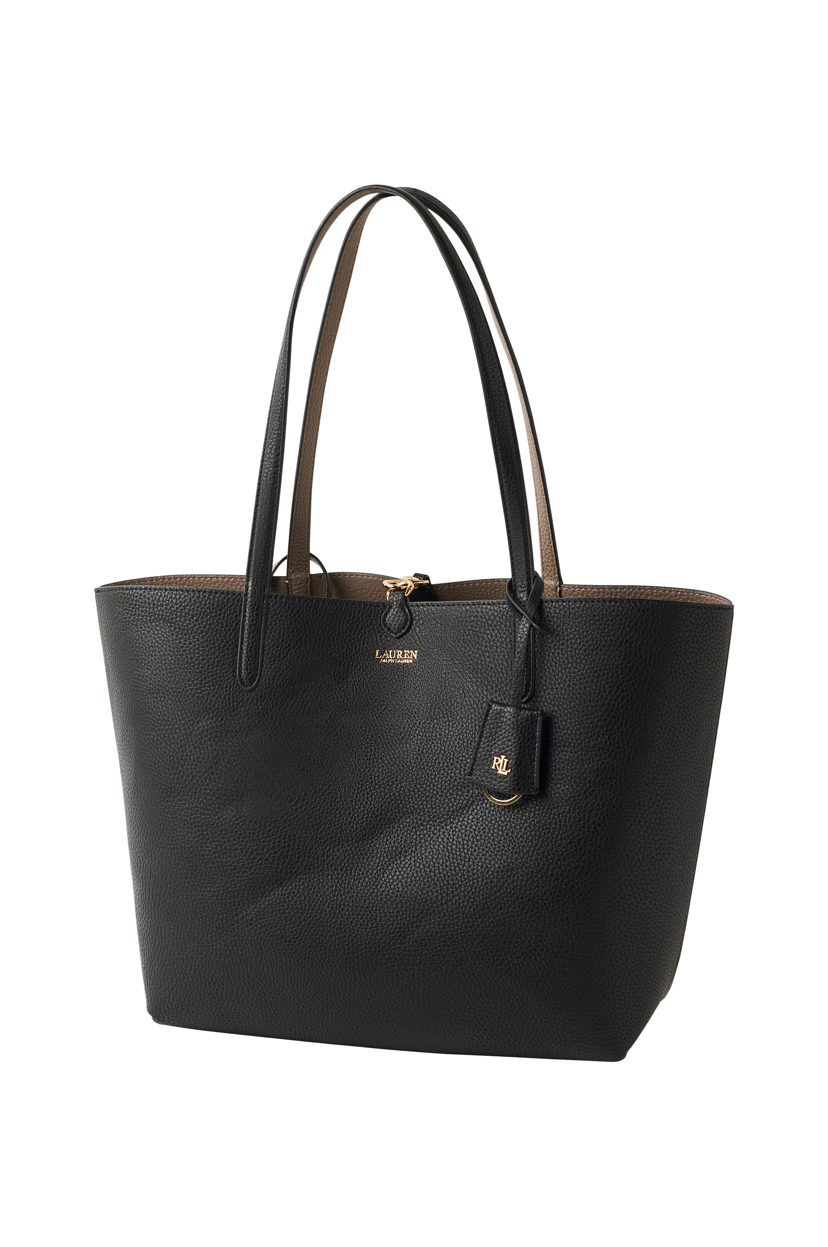 Veske i skinnimitasjon. Lukkes med karabinkrok i metall. To bærehåndtak. På det ene bærehåndtaket sitter en nøkkelring i et futteral. Inkludert liten sminkepung som lukkes med glidelås. Vesken er vendbar. Den andre siden har kontrastfarge. Mål: B41 x H32 x D12 cm. Mål på sminkepung: B20 x H12 cm.
