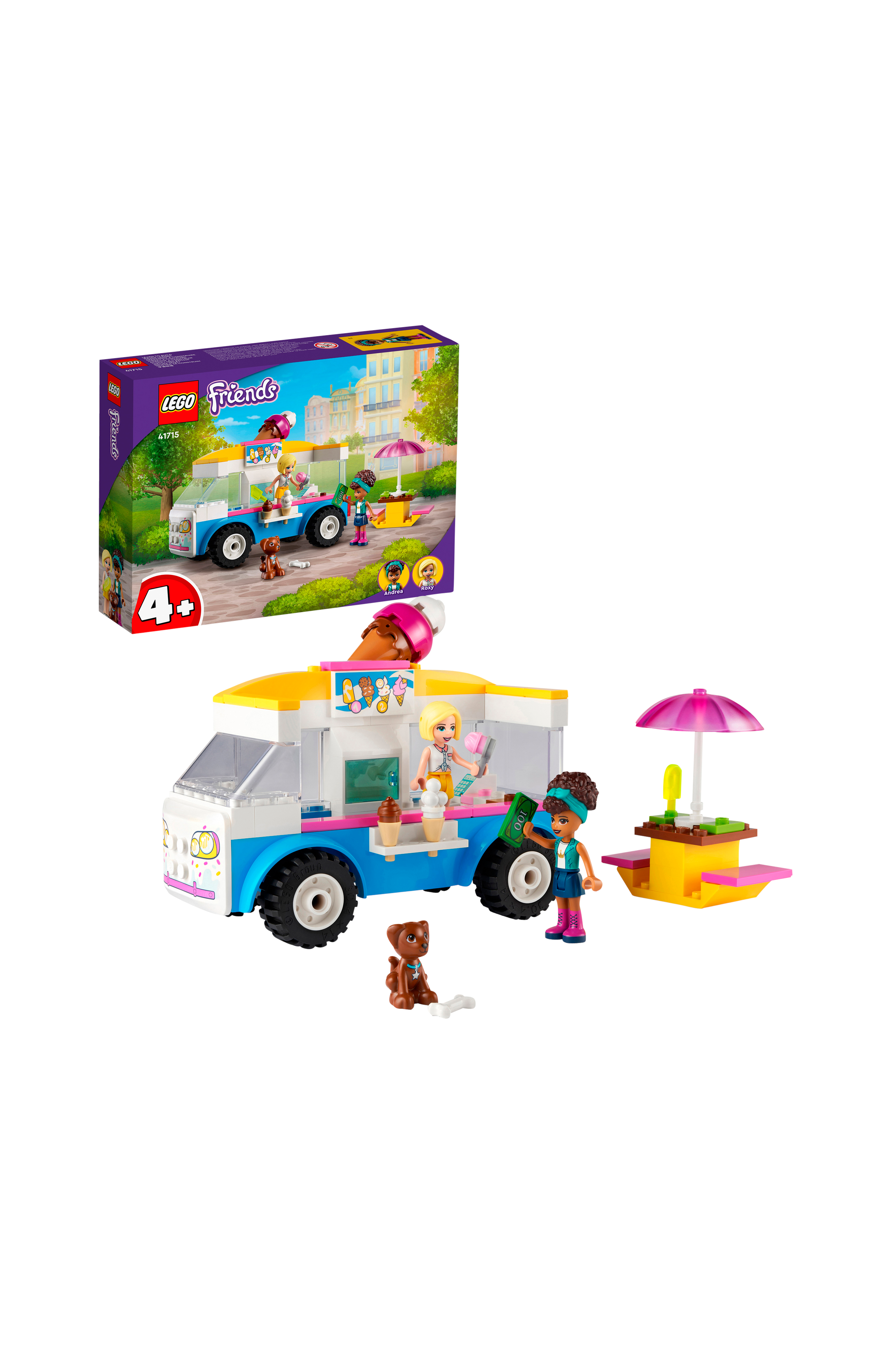 Det inkluderer minidukker av LEGO Friends Andrea og Roxy samt en søt hundefigur. Barn kan bygge en tøff lastebil og leke at de serverer avkjølende godsaker, eller de kan leke at de henger med venner på uteserveringen.