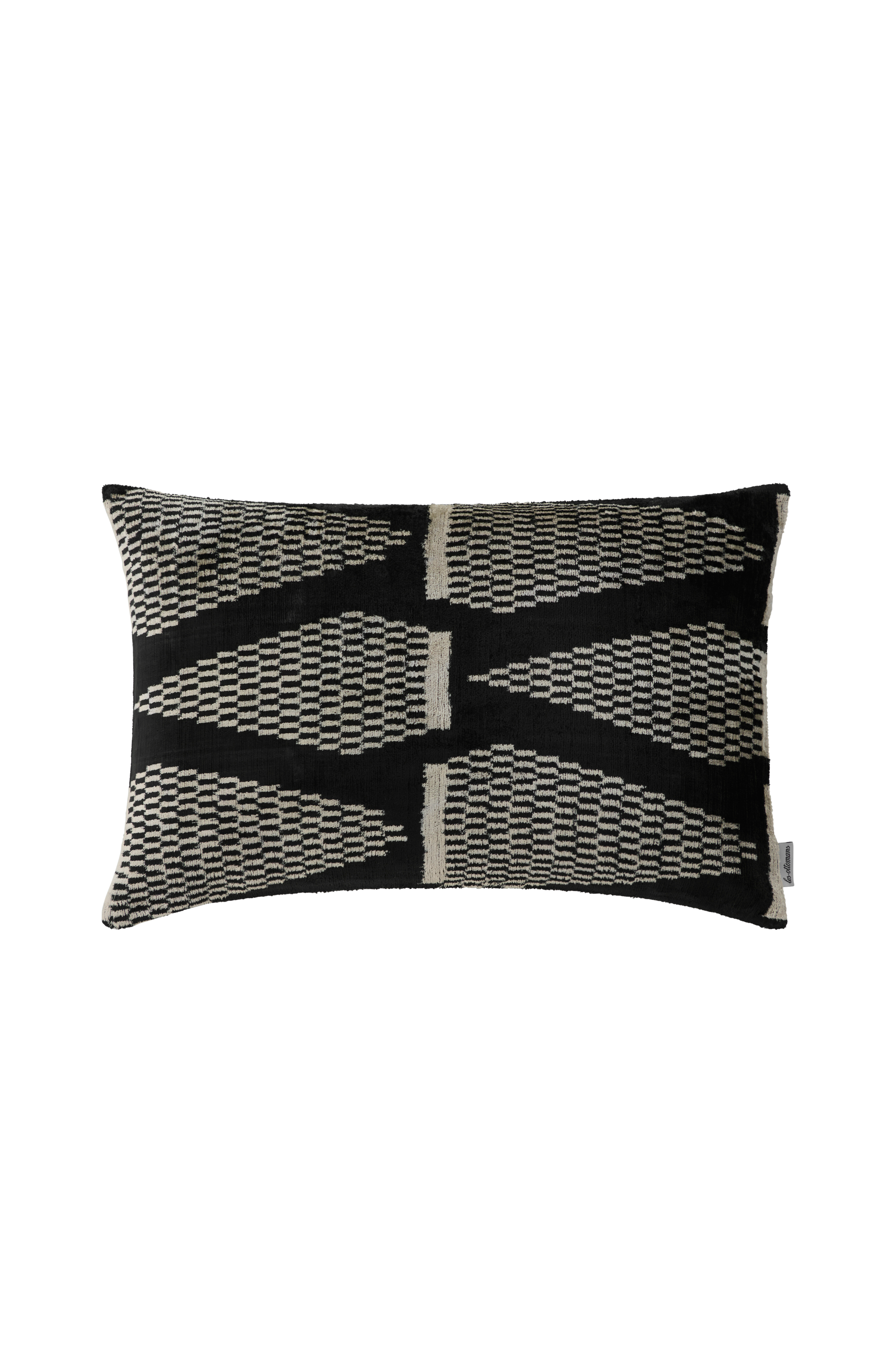 Håndlaget pute i silke og fløyel med Ottoman-mønster. Mykheten i kvaliteten og det moderne mønsteret skaper den perfekte miksen som løfter et rom. Putens bakside er i bomull. Puten er i størrelsen 40x60 cm, og har en myk innerpute fylt med dun. Renses.