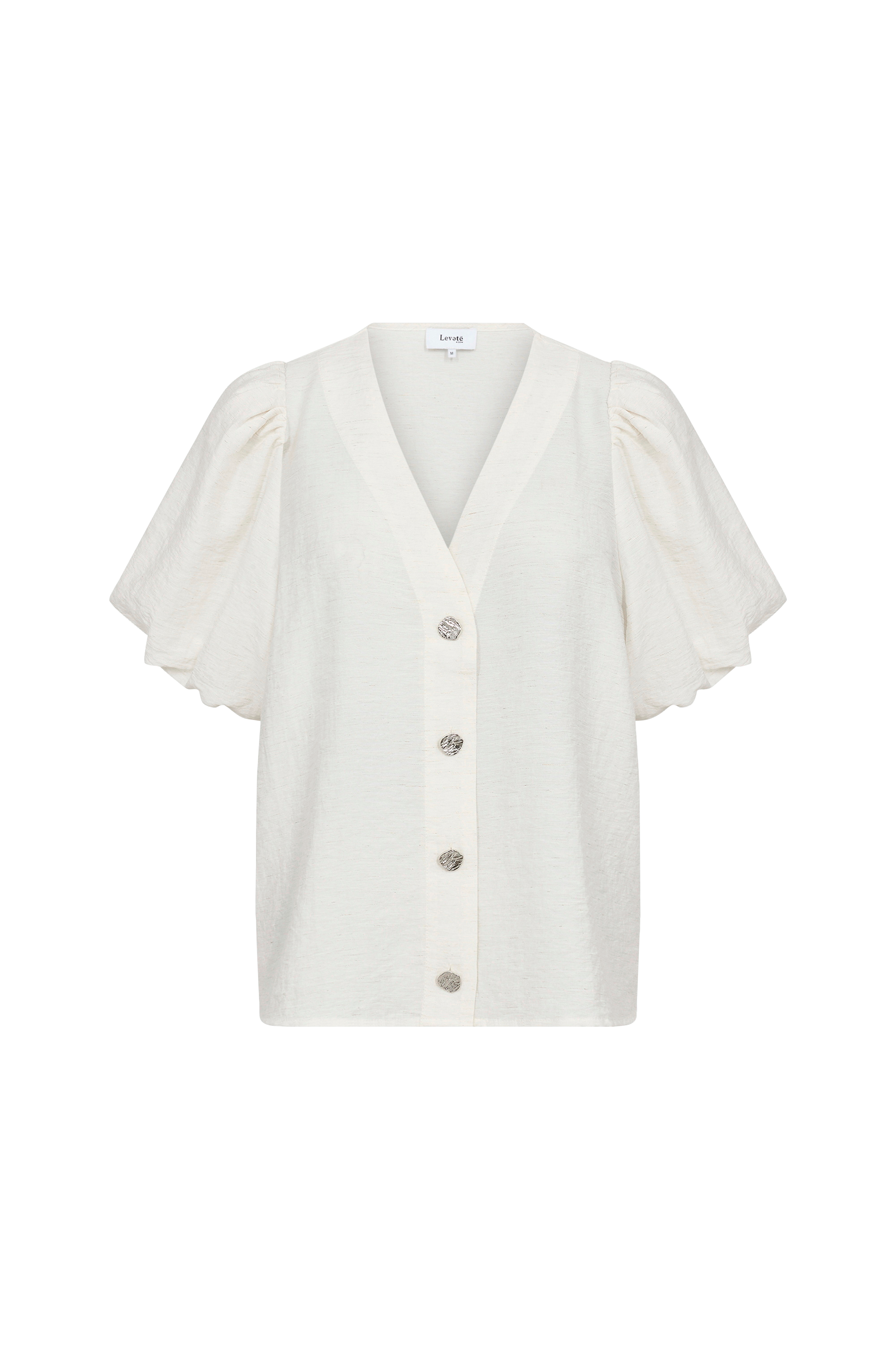 • Semitransparent bluse med struktur• V-formet hals• Lukning med dekorative, sølvfargede knapper• Rynke på skuldrene• Korte ballongermer med gummistrikk i ermeslutten