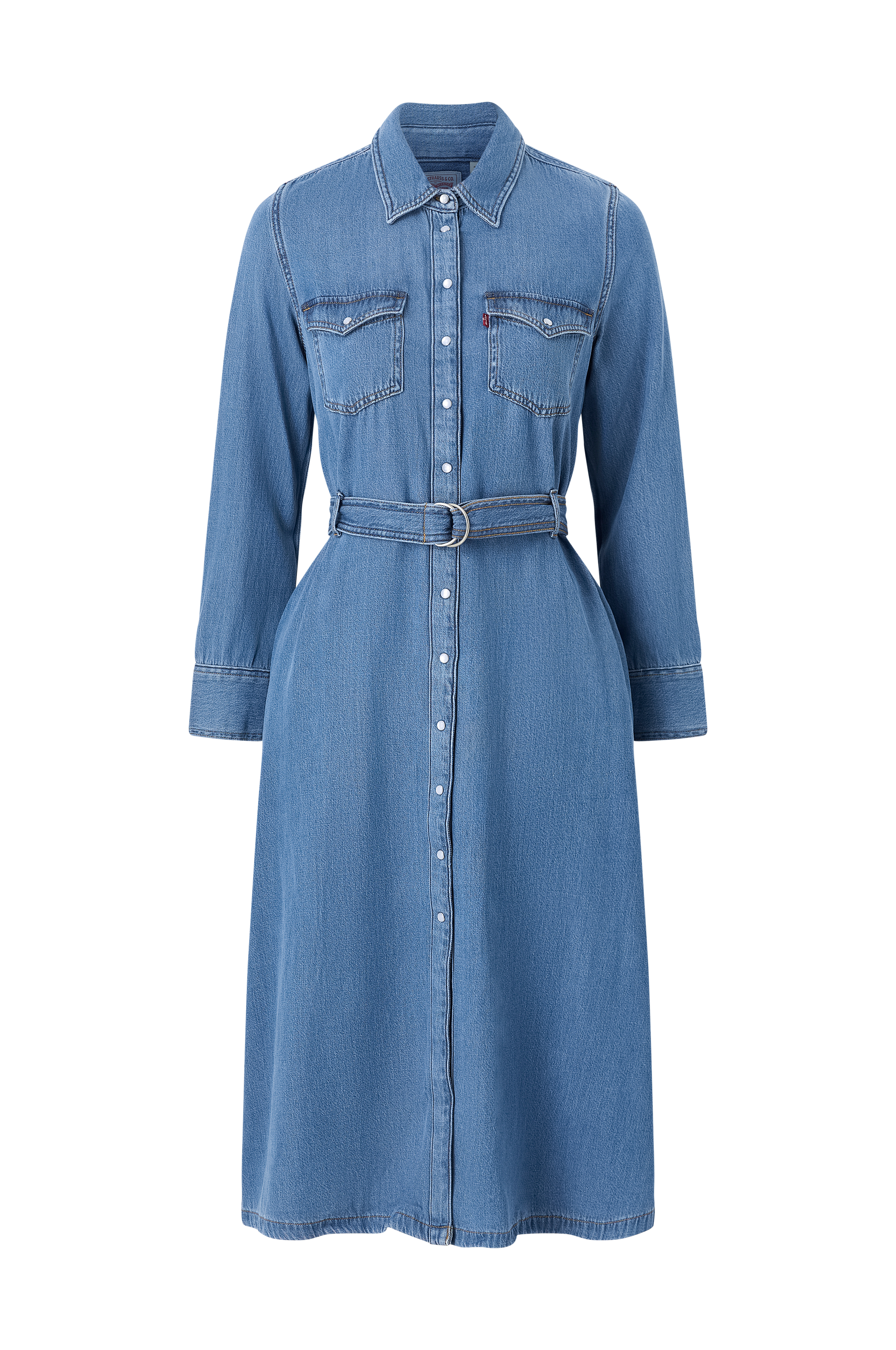 • Lang kjole i bomullsdenim• Dekorative knapper• To brystlommer med kneppbare lommeklaffer• Sidelommer• Lange ermer med knapper i ermeslutten• Knytbart belte ved midjen• Utsvingt skjørt• Lengde: 115 cm i størrelse S