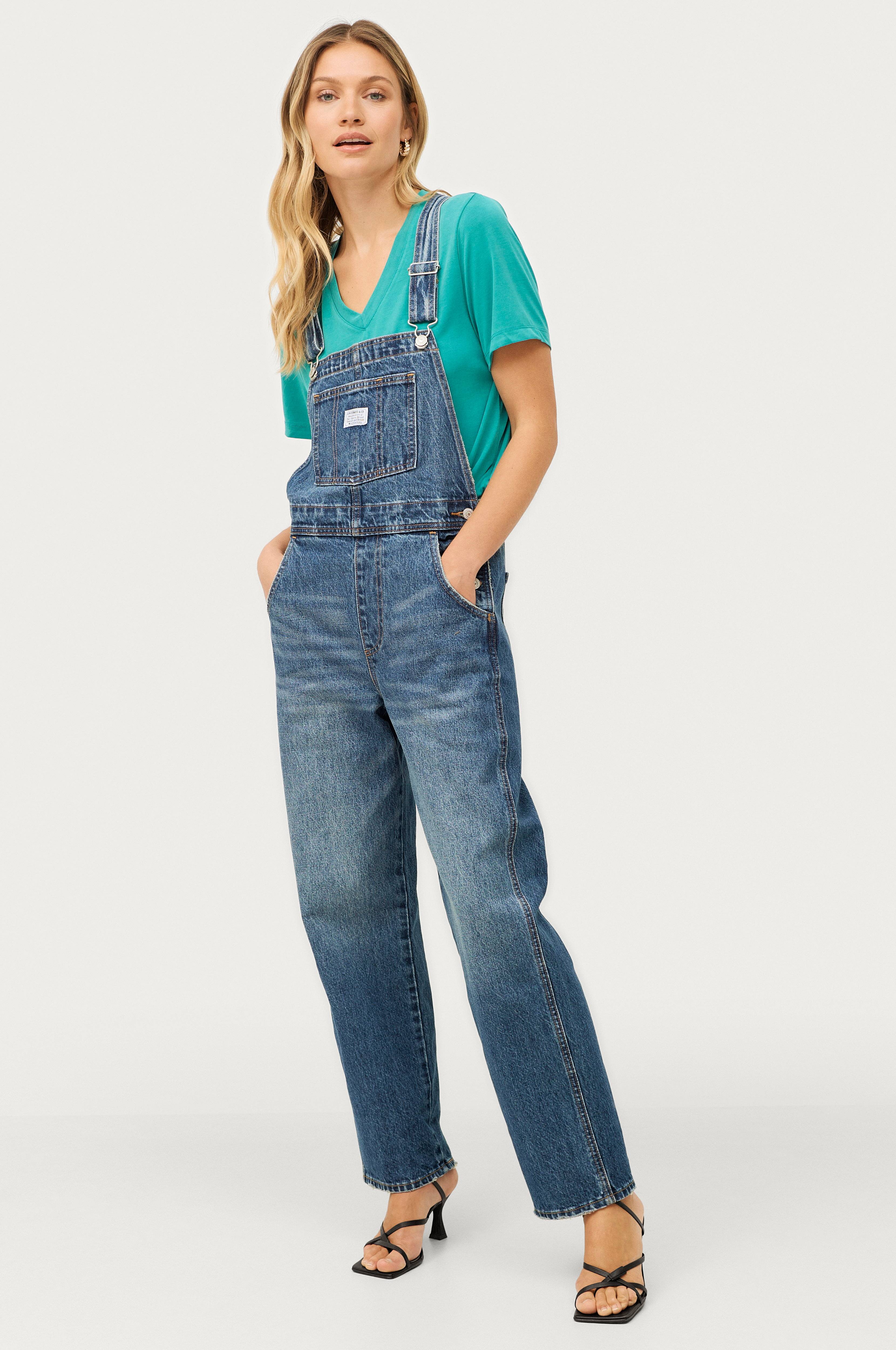 • Laget av bomullsdenim• Justerbare seler• Knapper i sidene• To baklommer• Sidelommer• Lomme midt foran