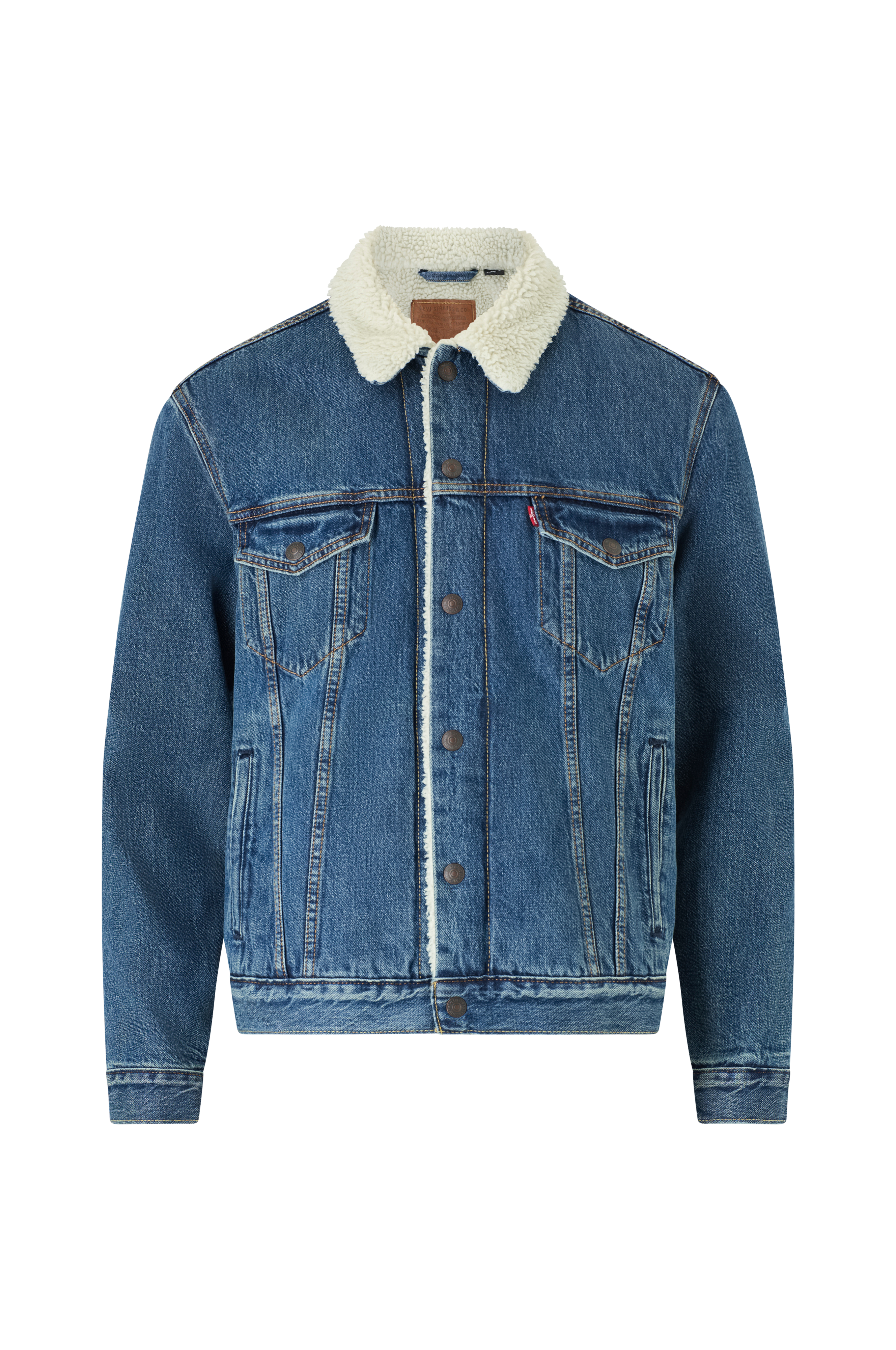 Jakke Sherpa Trucker fra Levi's. Klassisk jeansjakke med teddyfôr og teddykrage. Breddeskåret modell med trykknapper og to brystlommer med klaff. To innfelte lommer og justerbar hempe med knapp nederst på linningen. Lengde ca. 65 cm i str. M.