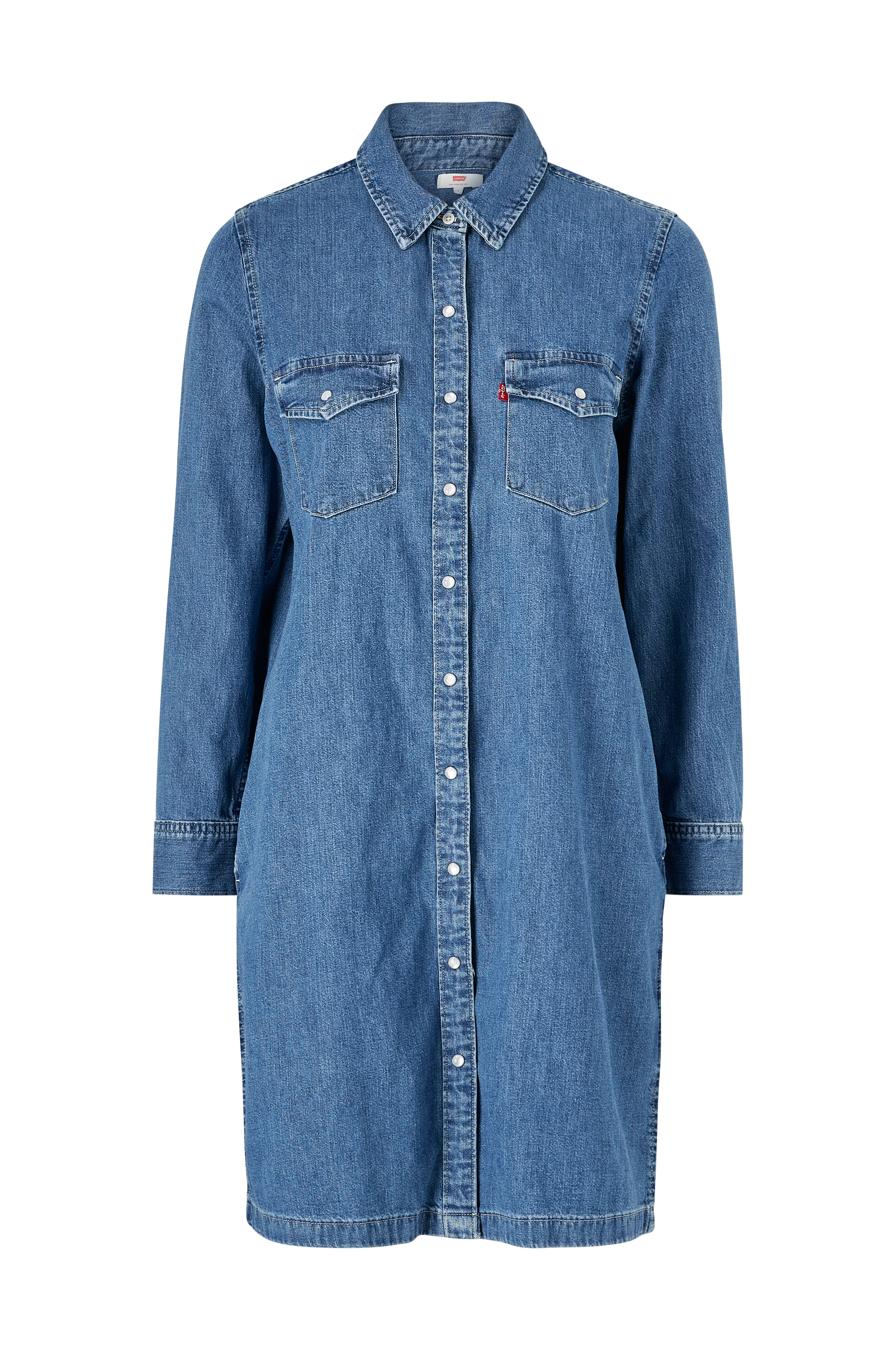 Jeanskjole Selma Dress fra Levi's i bomullsdenim. Rett modell med trykknapper i perlemorlook. Lomme i sidene, og to brystlommer med lommeklaff og knapp. Lange ermer med to knapper i ermekantene. Lengde ca. 92 cm i str S.