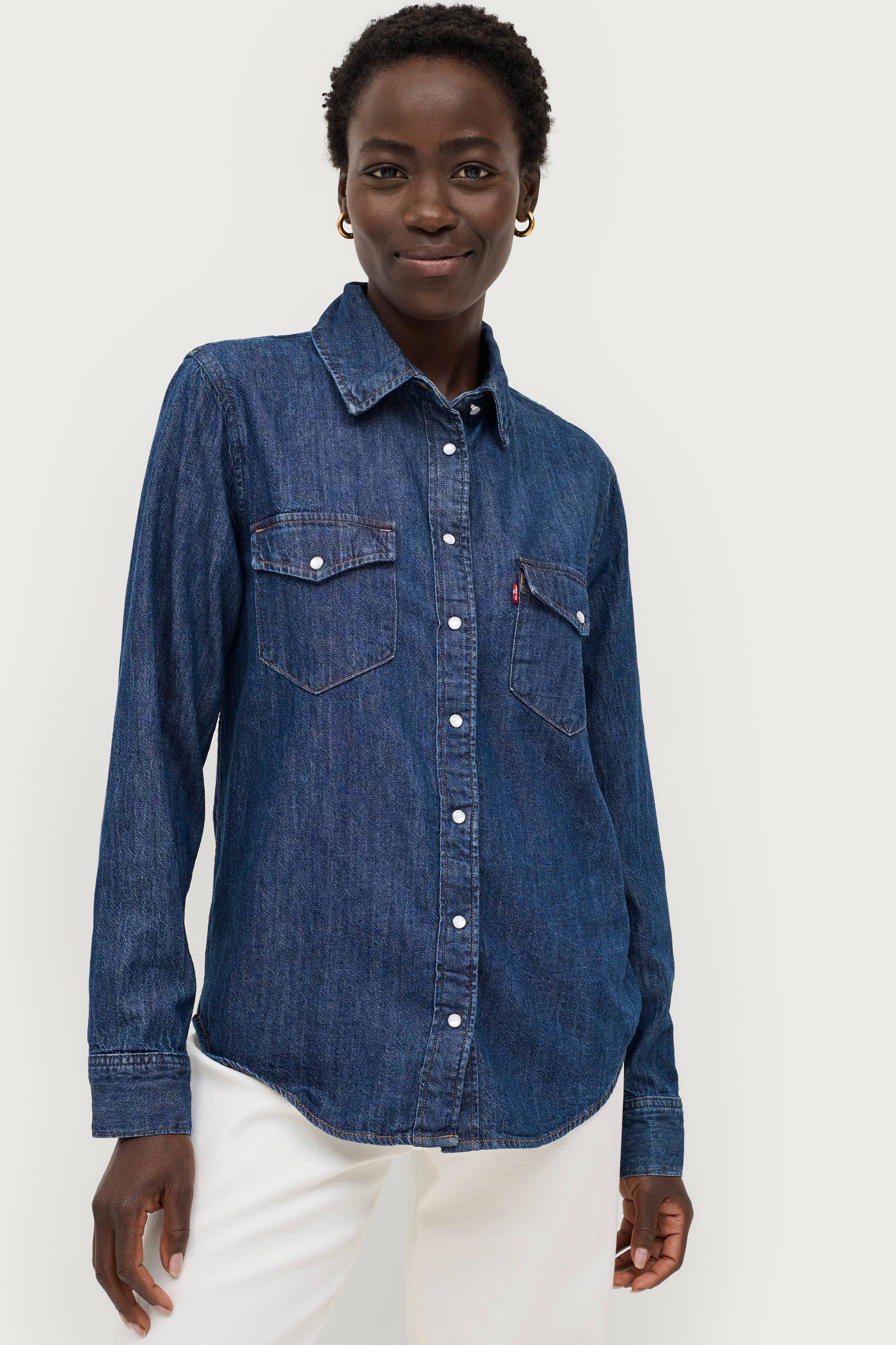 Jeansskjorte Essential Western Going Steady fra Levi's. Lett figurformet modell med liten krage og trykknapper hele veien foran. V-skåret bærestykke bak, og brystlommer med klaff.