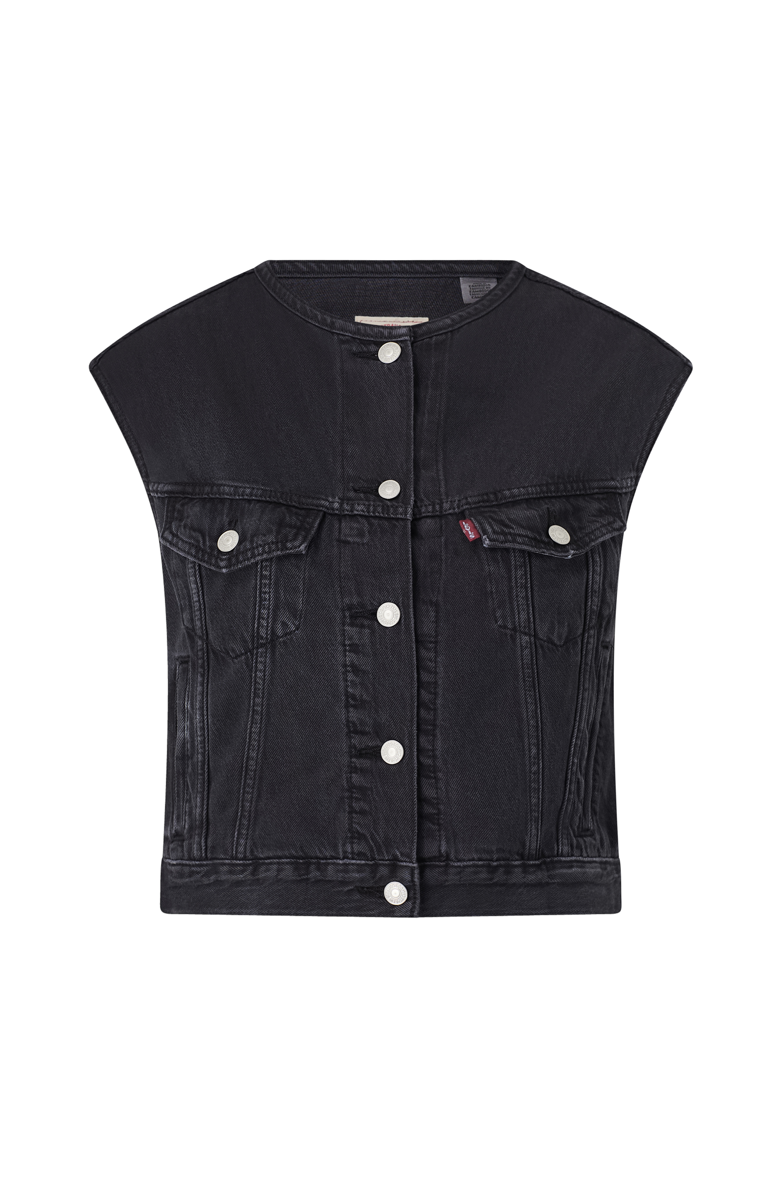 • Jeansvest med rund hals• Knapper foran• Brystlommer med lokk• Sidelommer• Justerbare remmer nede i sidene