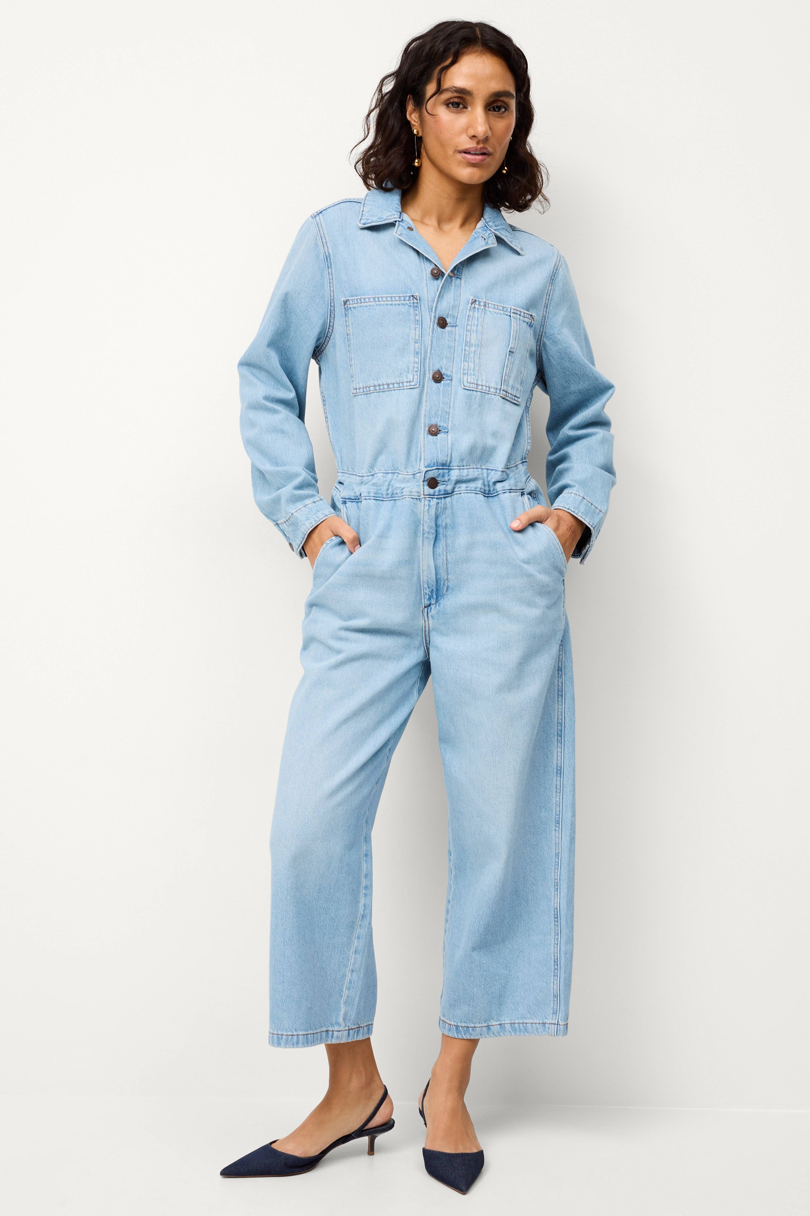 • Snekkerbukse i denim• Knapper foran• Lynlås• To sidelommer• To baklommer• To brystlommer