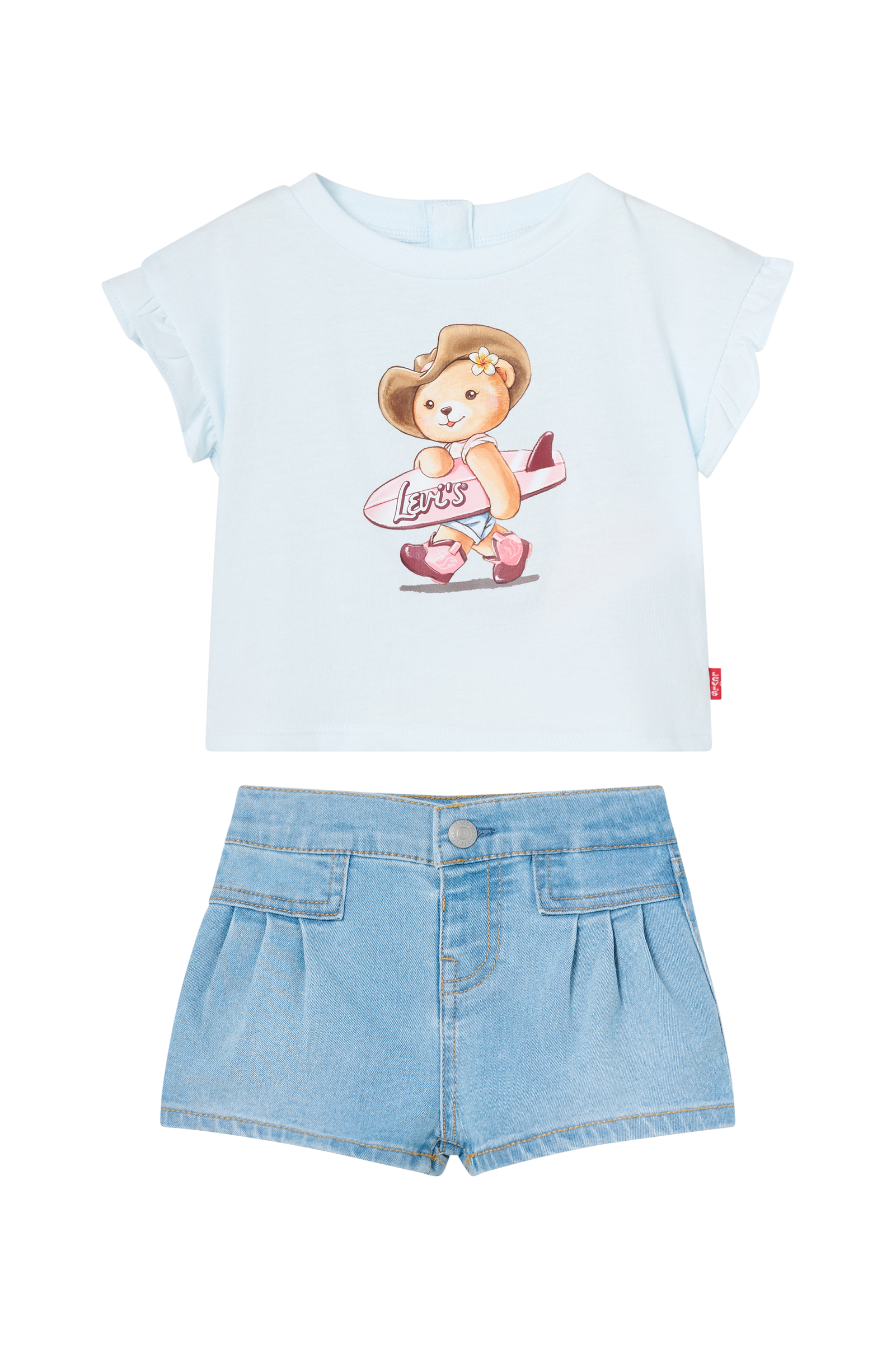 • 2-delt sett med topp og shorts• Topp med trykk foran• Rund hals med trykknapper i nakken• Korte volangtermer• Jeans-shorts med brettete folder foran• Hektelukning ved midjen• Baklommer