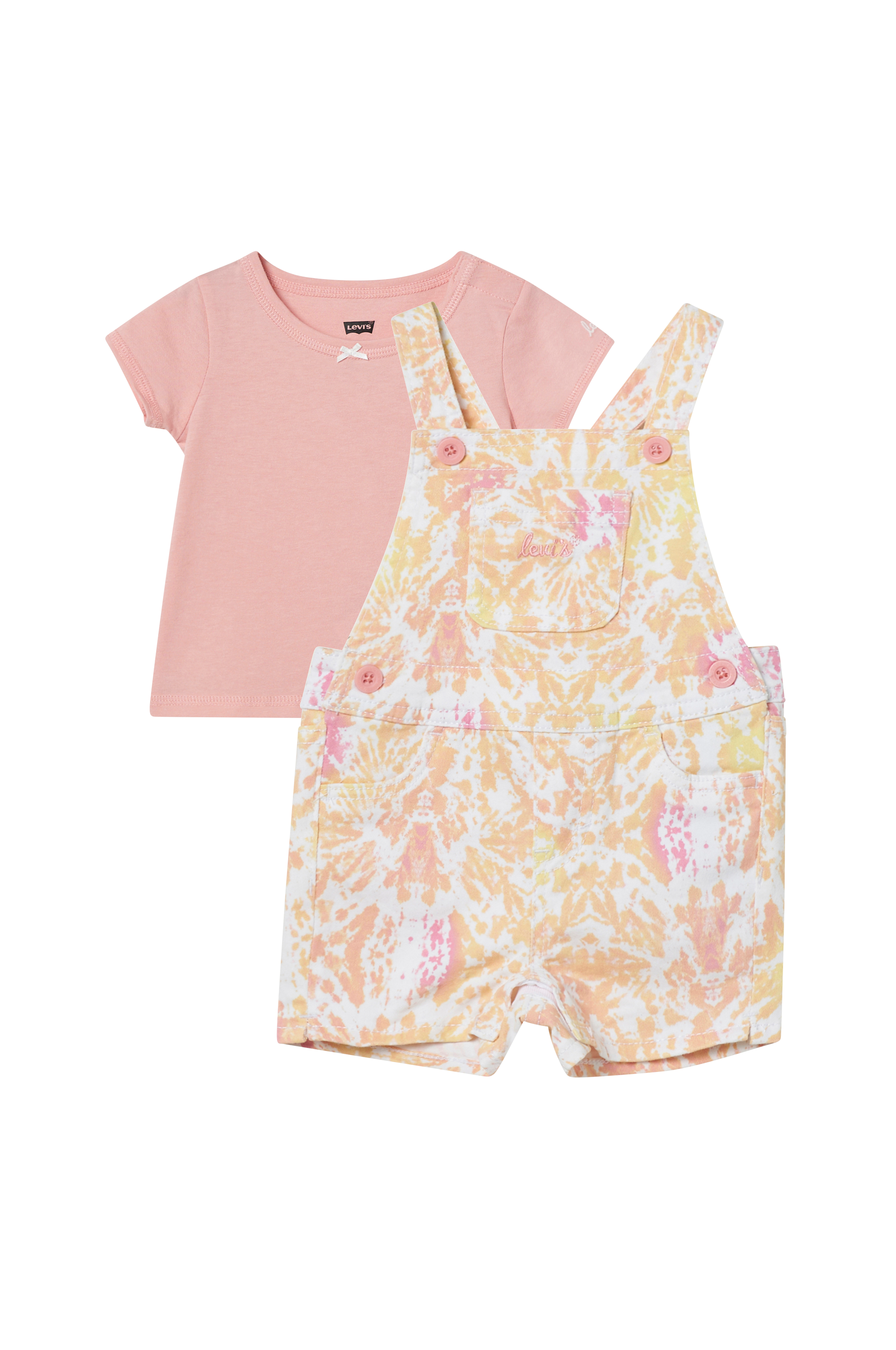 Sett med kortermet T-shirt og kort, mønstrete selebukse. Trykknapper i skrittet og på den ene skulderen.