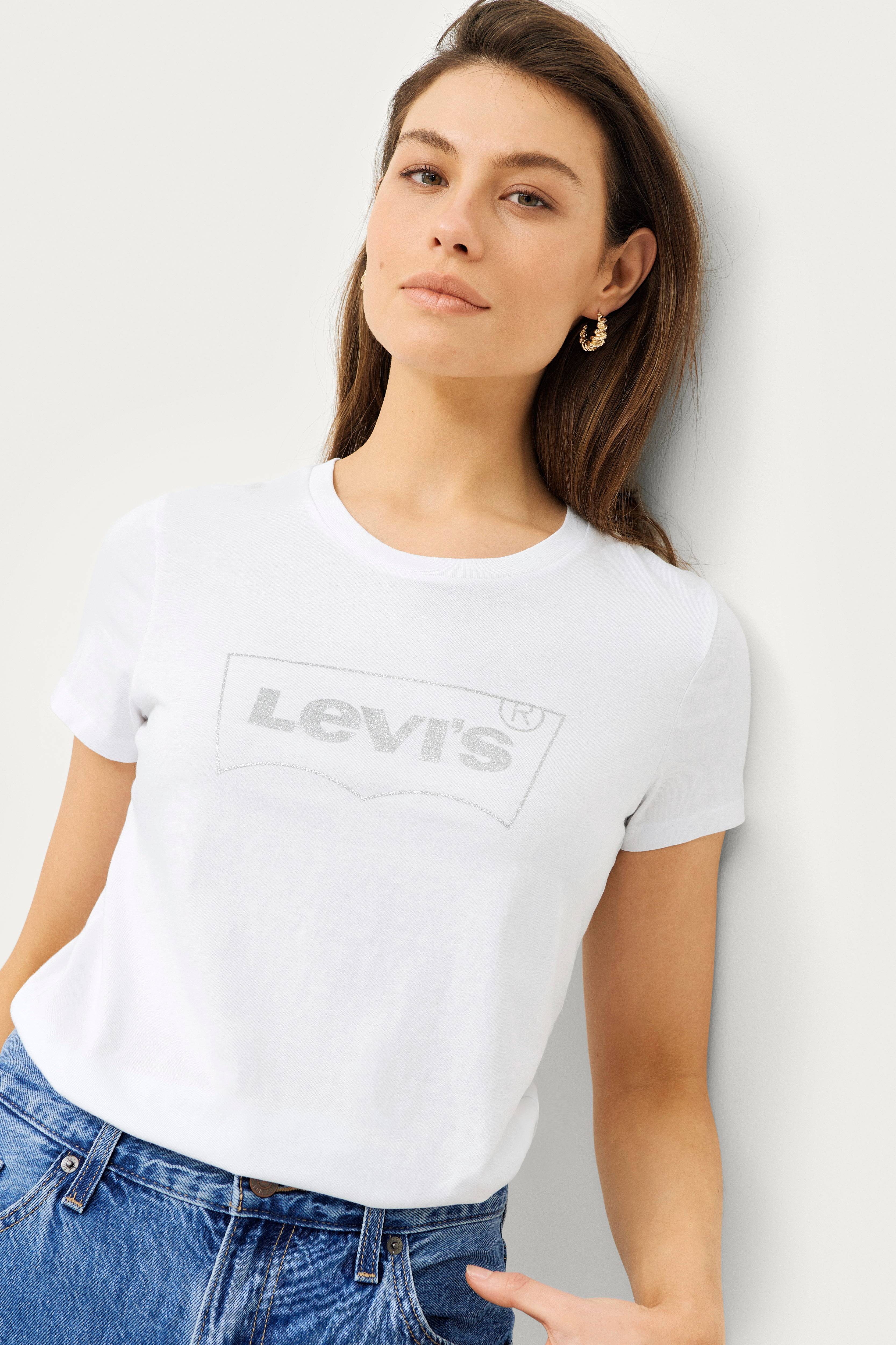 Topp The Perfect Tee fra Levi s med trykt logo på brystet. Kort erme og vid hals med ribbet kant. Lengde ca 60 cm i str M.