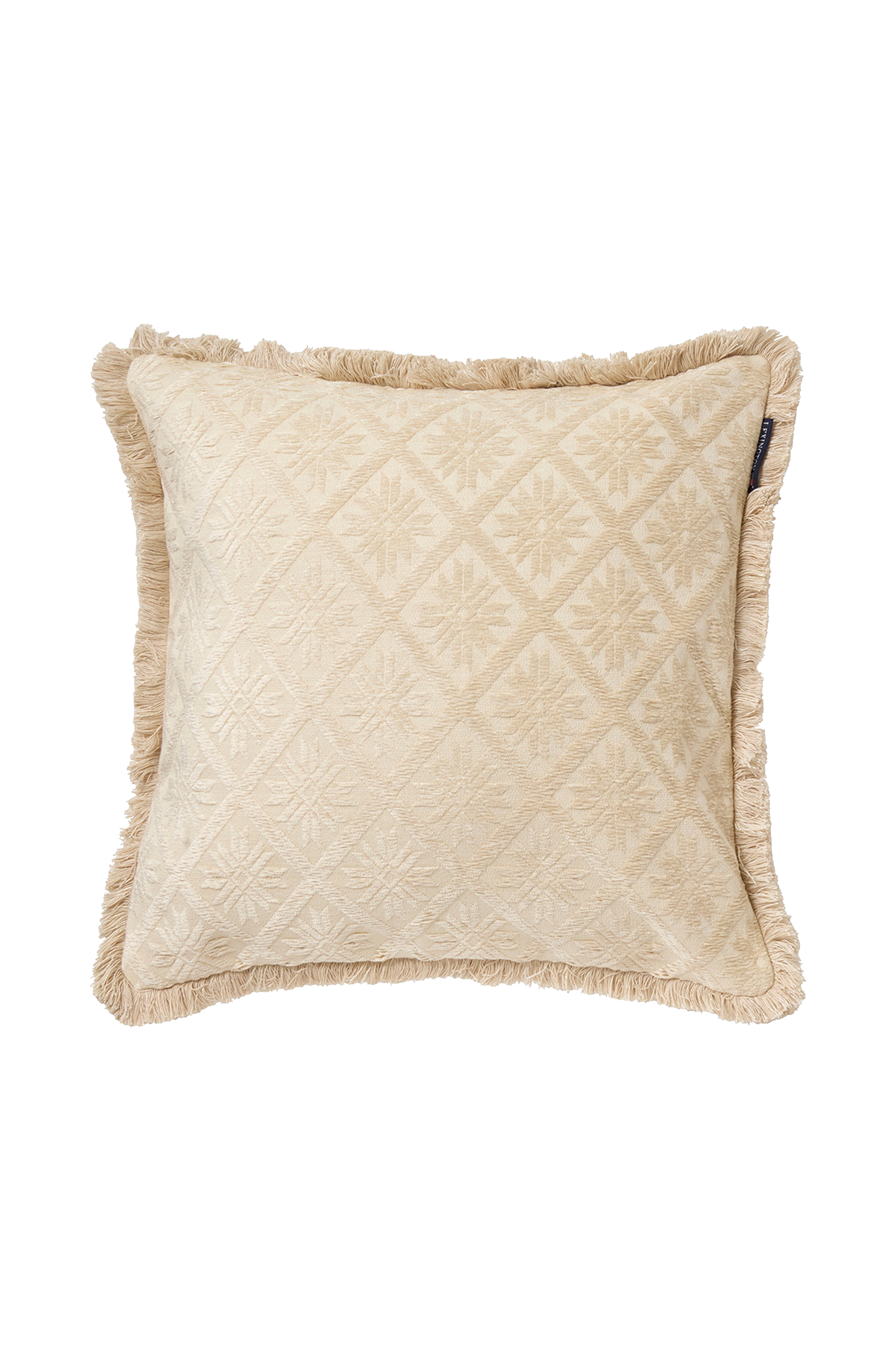 Dette jacquard-putevaretrekket er laget av en luksuriøs viskose- og bomullsblanding og har et eksklusivt, originalt vevd design som gir sofistikert tekstur til ethvert rom. Den myke viskosebomullsfronten kompletteres av en solid bomullsfløyelsrygg for optimal komfort og kvalitet. Putevaretrekket har fine frynser i bomull og viskose hele veien rundt, og det er omhyggelig håndverksmessig utført med en brodert tekstlogo øverst midt bak og en vevd Lexington-logoetikett i øvre høyre hjørne. Den skjulte fargematchede glidelåsen nederst sørger for et sømløst utseende samtidig som den gir enkel tilgang.