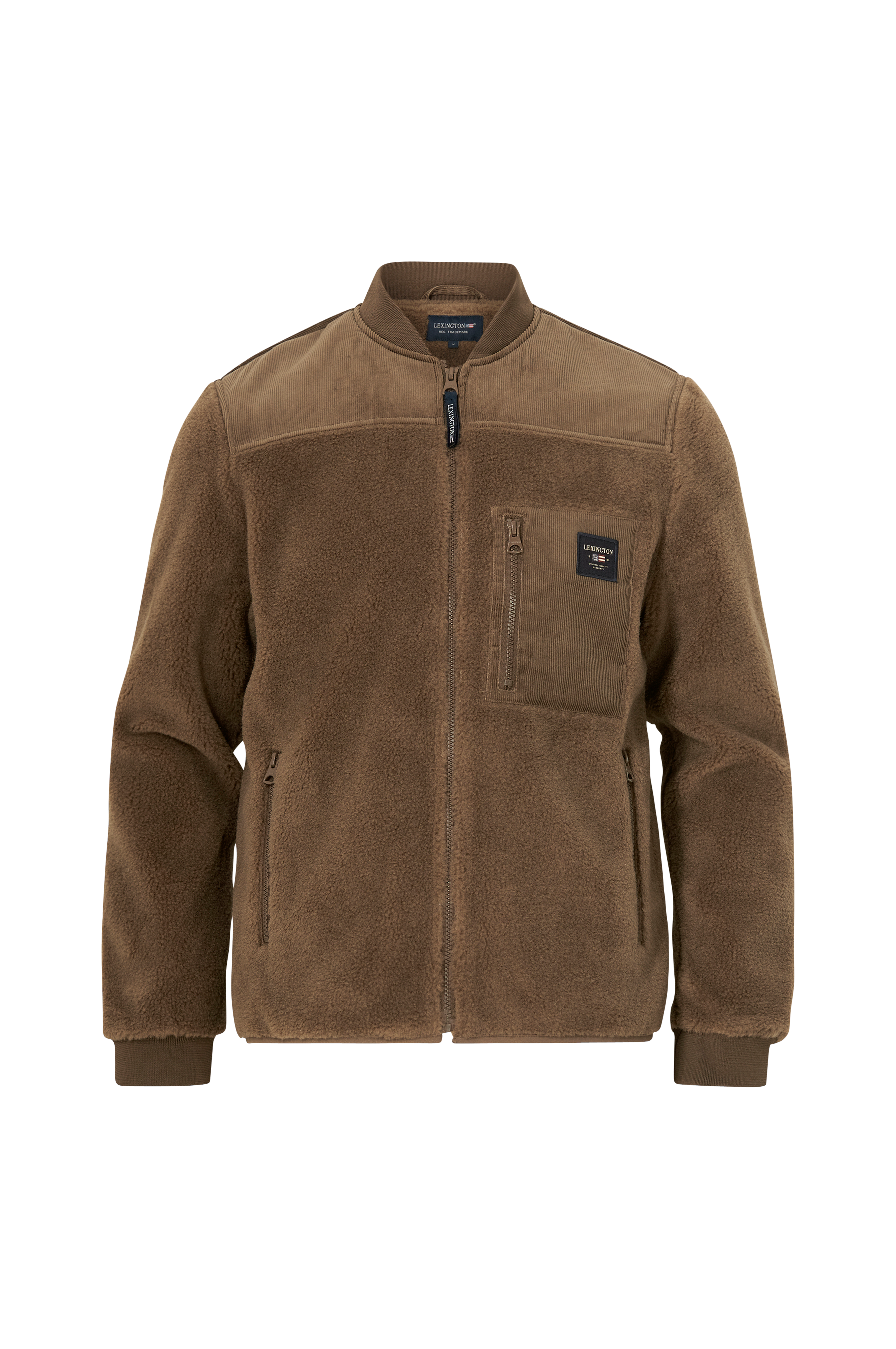 Jakke av teddy i ullblanding med kontrasterende kordfløyel øverst og på brystlommen.