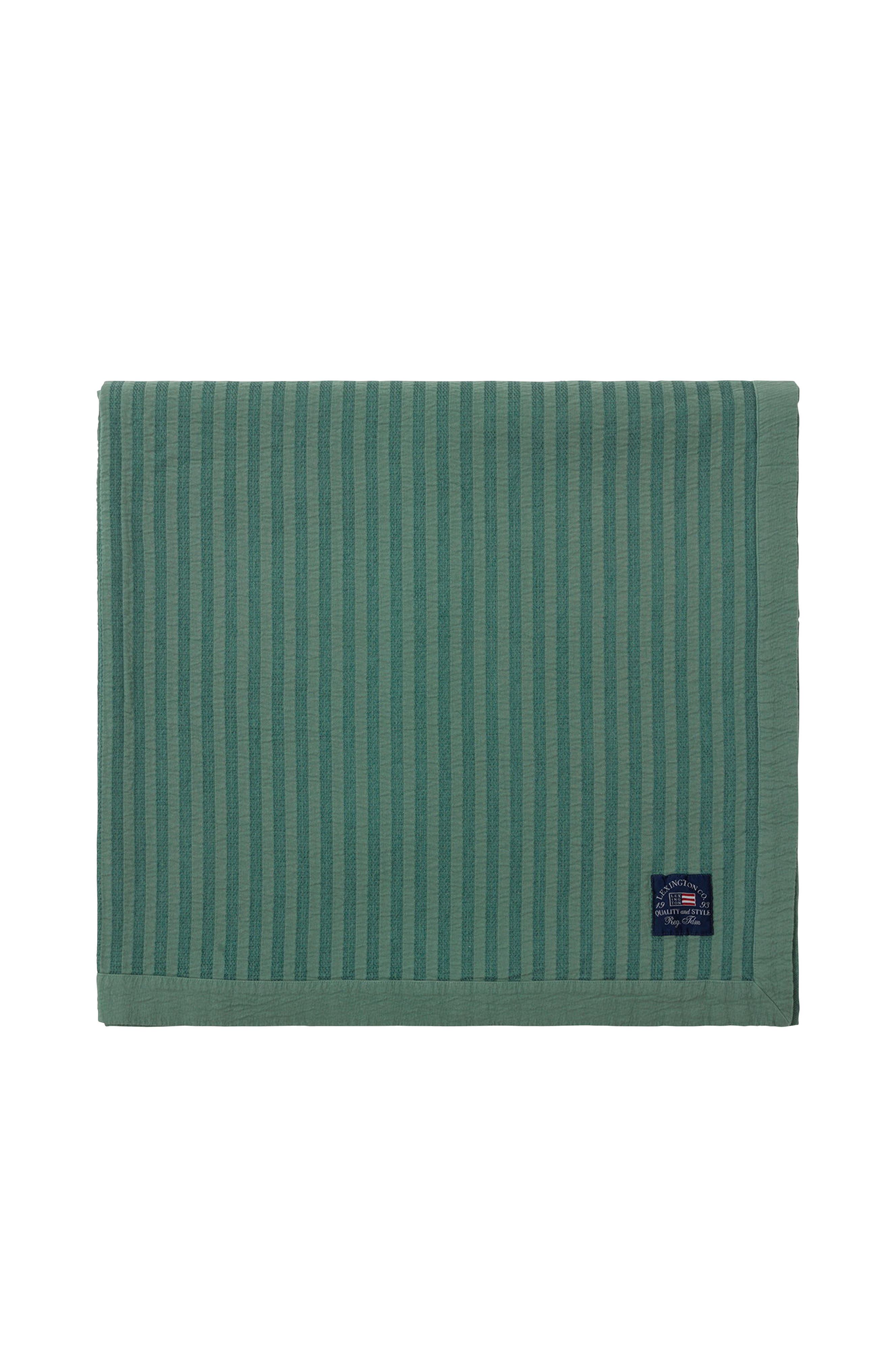 Sengeteppe vevd i en myk blanding av bomull og viskose med overfargede, tonede striper. Sengeteppet er produsert i Portugal av bomull og viskose, og har detaljsøm langs den brettede falden.