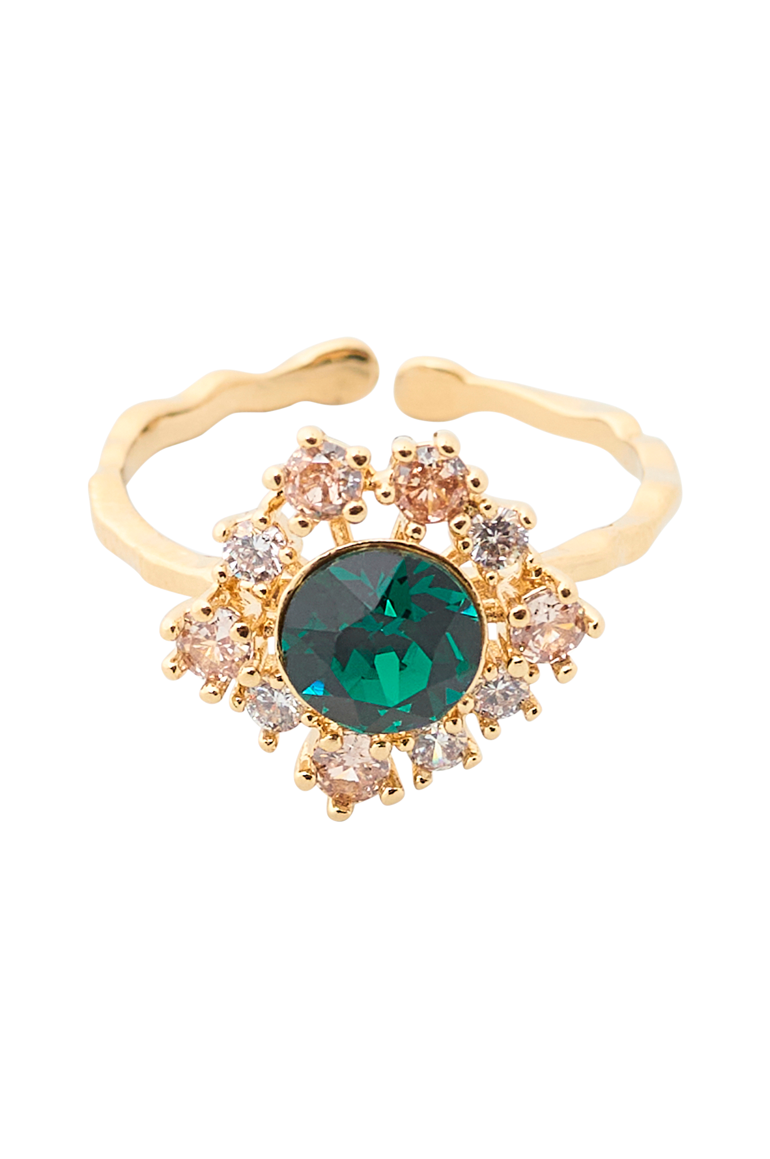 • Gullbelagt ring i messing• Stor, farget stein med glitrende krystaller rundt• Justerbar størrelse