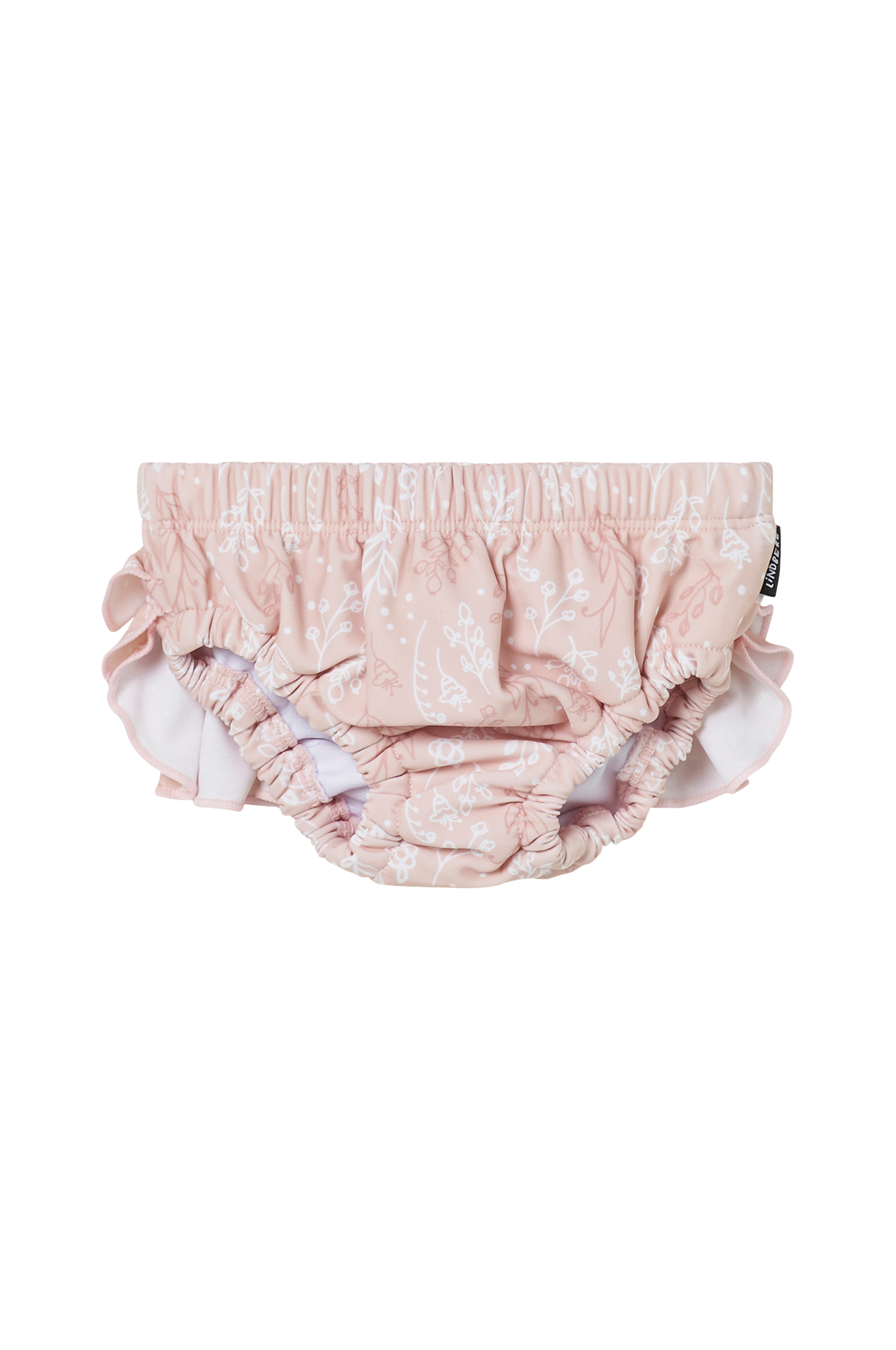 Bleiebadebukse med volanger. Kan brukes ved bading både inne og ute. Stoffet har solfaktor 50+, og innsiden har «bleiefunksjon» for å unngå lekkasje. Elastisk benåpning og elastisk midje med innvendig snøring.