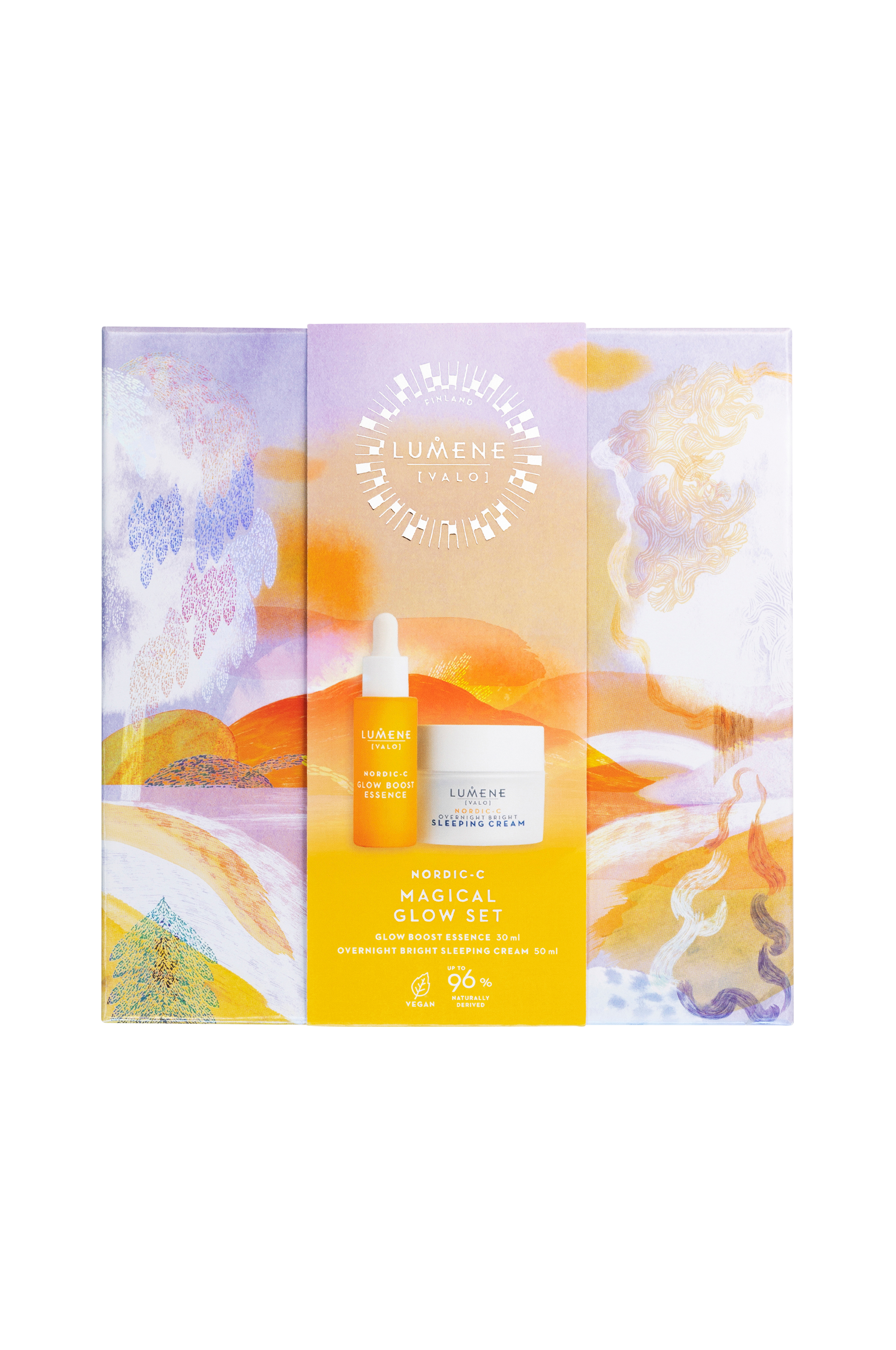Sett som får huden til å stråle - serum og gjenoppbyggende nattkrem.Produktene har en vegansk sammensetning beriket med C-vitamin og antioksidantrike nordiske molter som gir naturlig glød.Passer alle hudtyper.