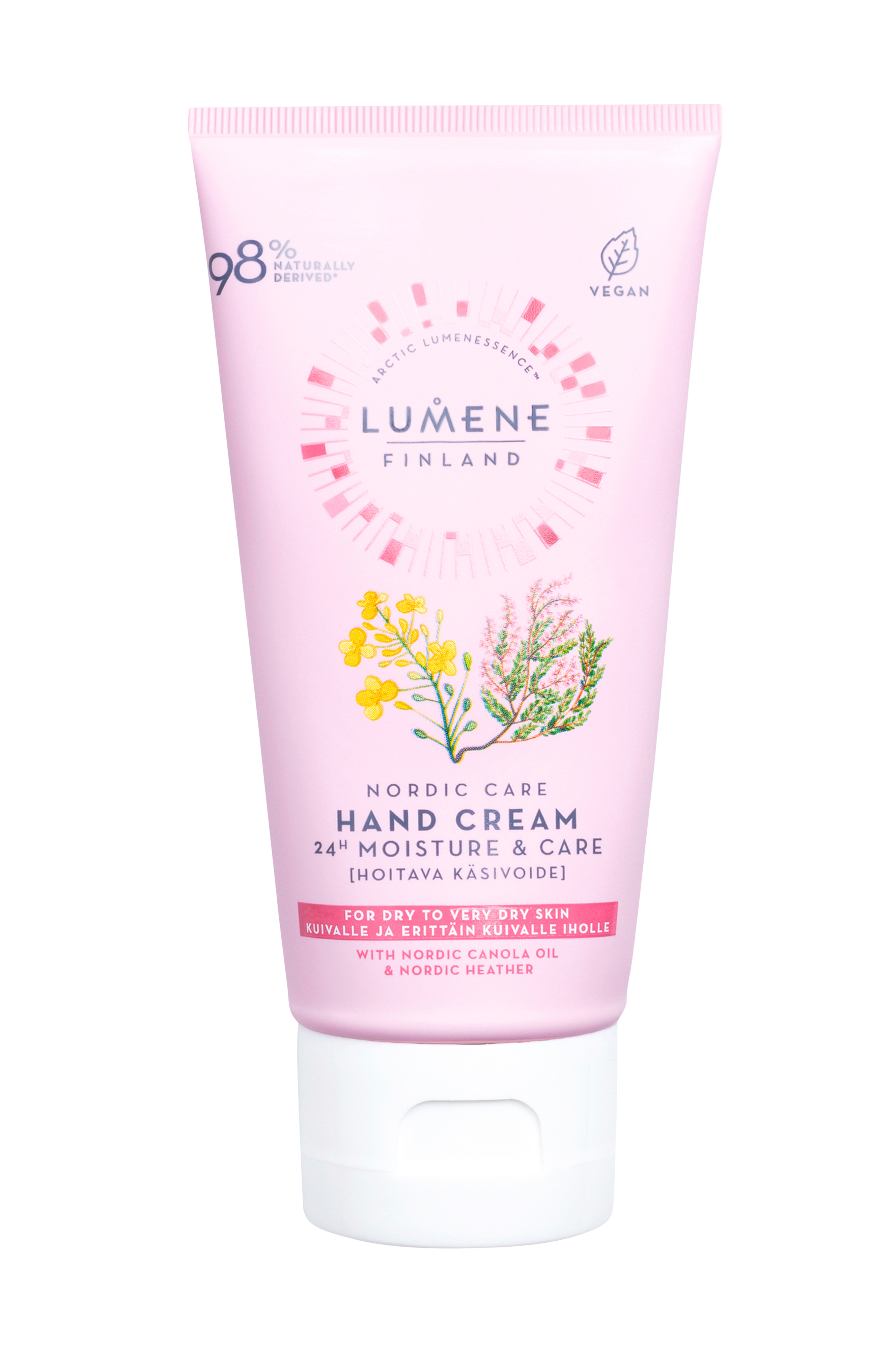 En luksuriøs håndkrem som reduserer tørrhet fra første gangs bruk og som fukter huden. Den pleiende sammensetningen inneholder beskyttende nordisk rapsolje og beroligende lyngekstrakt, noe som også gjør den egnet for svært tørr hud. Produktet er fint både for hud og miljø med 98% naturlig fremstilte ingredienser i den veganske sammensetningen. Emballasjen er helt gjenvinnbar og delvis produsert av gjenvunnet plast.