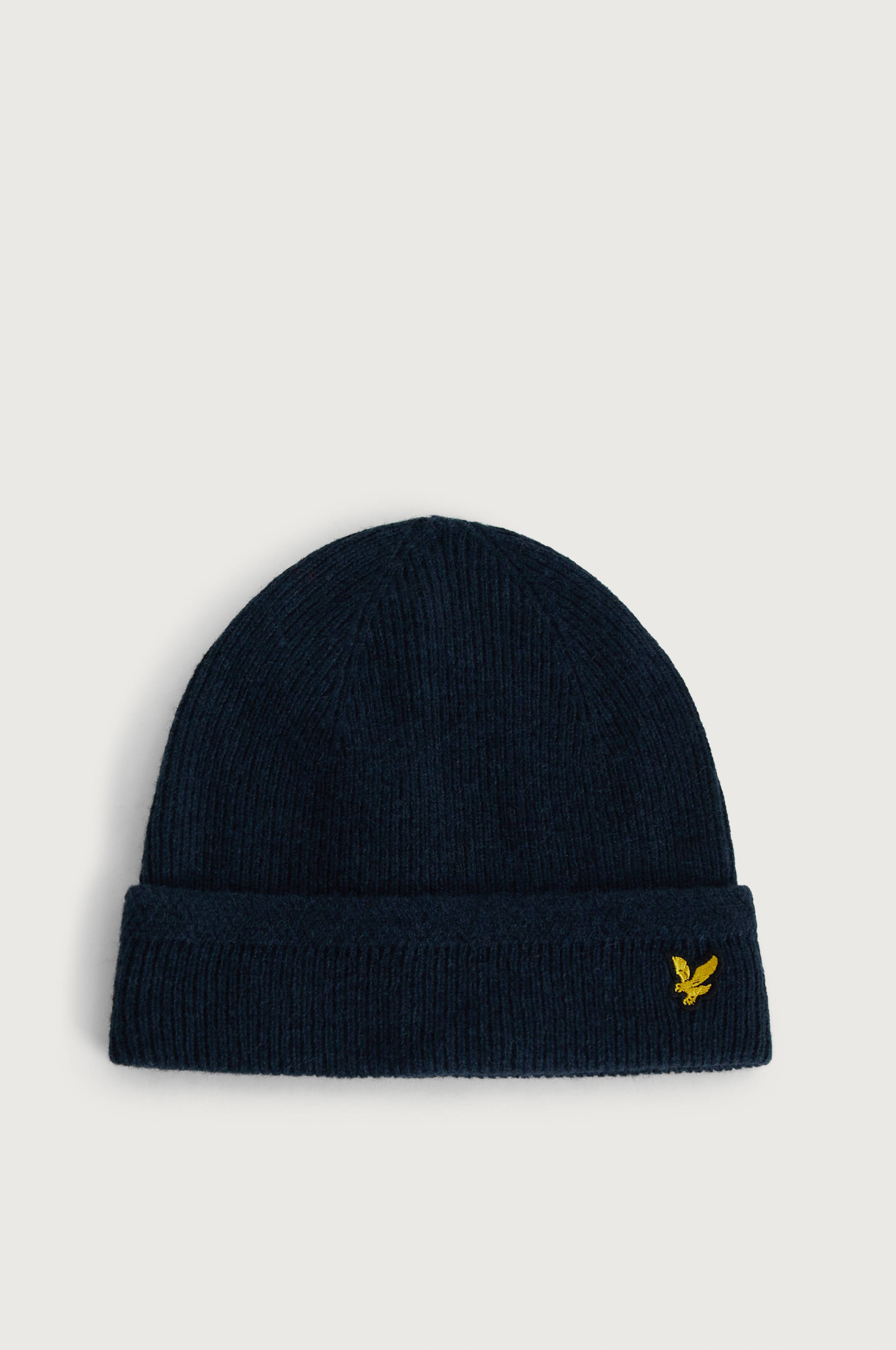 Ribbestrikket lue fra Lyle & Scott i en myk ullblanding. Luen har en brodert logo på oppbretten.