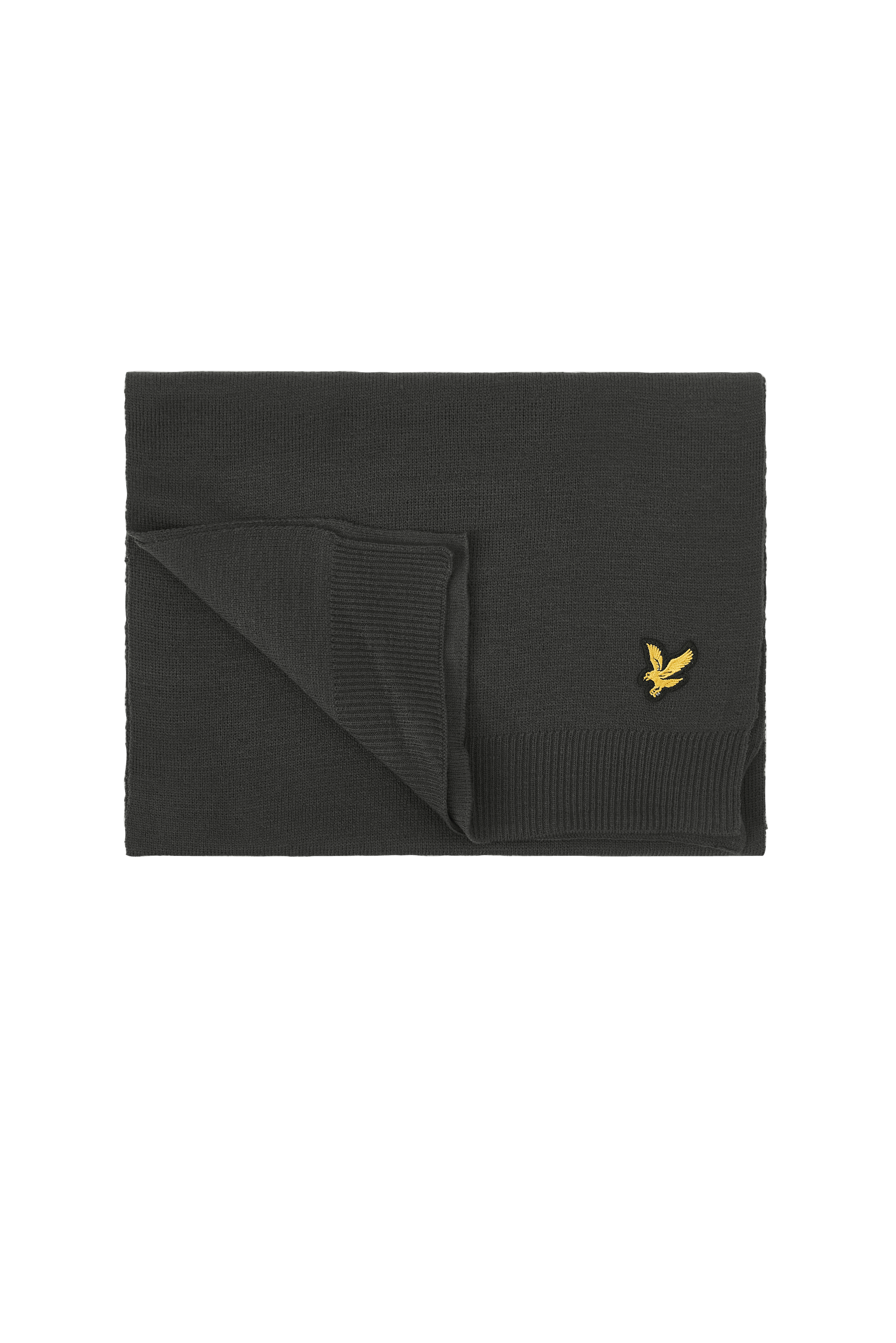 Finstrikket skjerf. Mål: Bredde 26 cm, lengde 168 cm. Ribbede kanter i kortendene, og en brodert logo på den ene kortsiden.