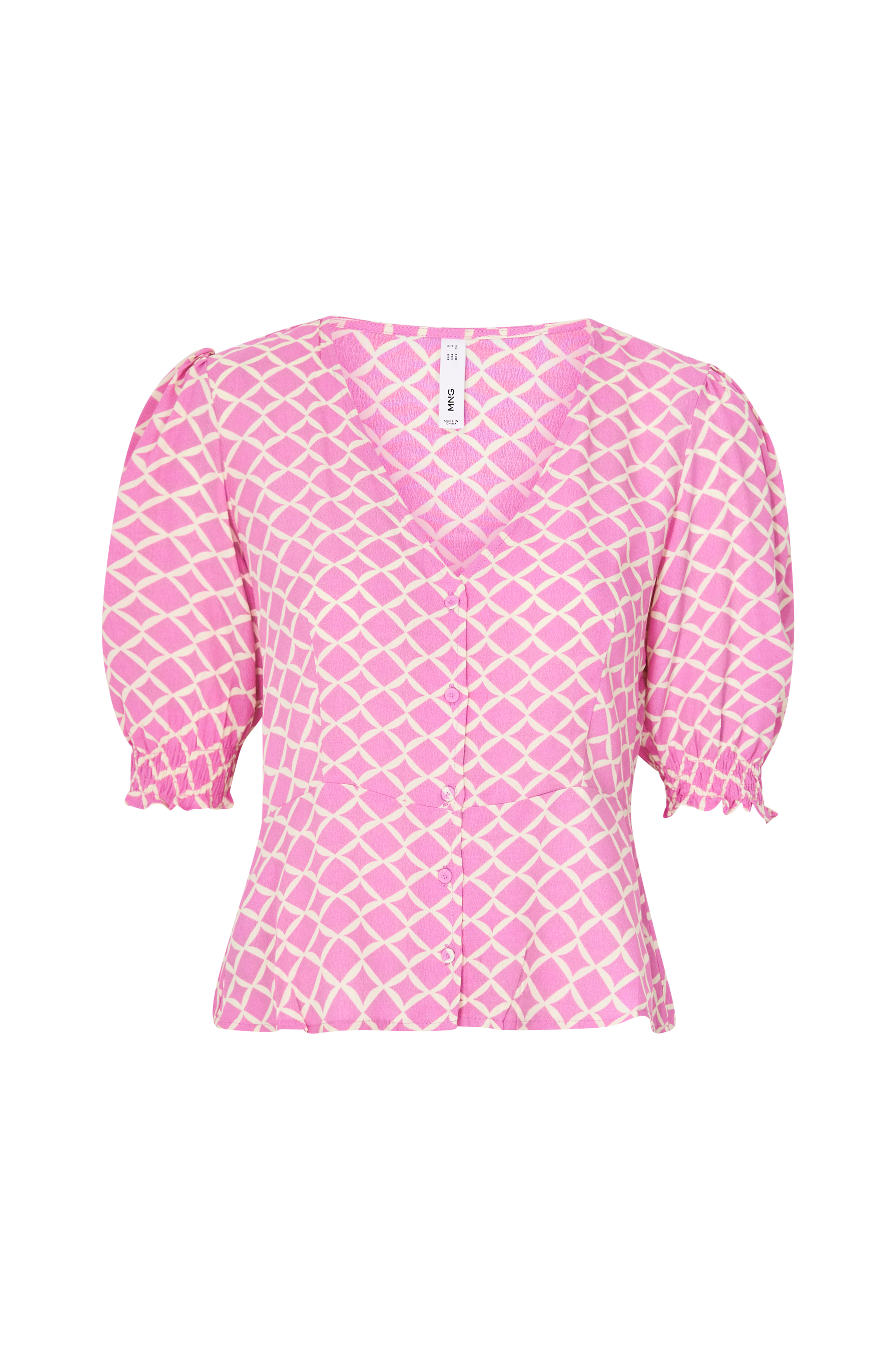 • V-hals snitt• Knapper foran• Halvlange bobleermer med vaffelsøm i ermeslutten