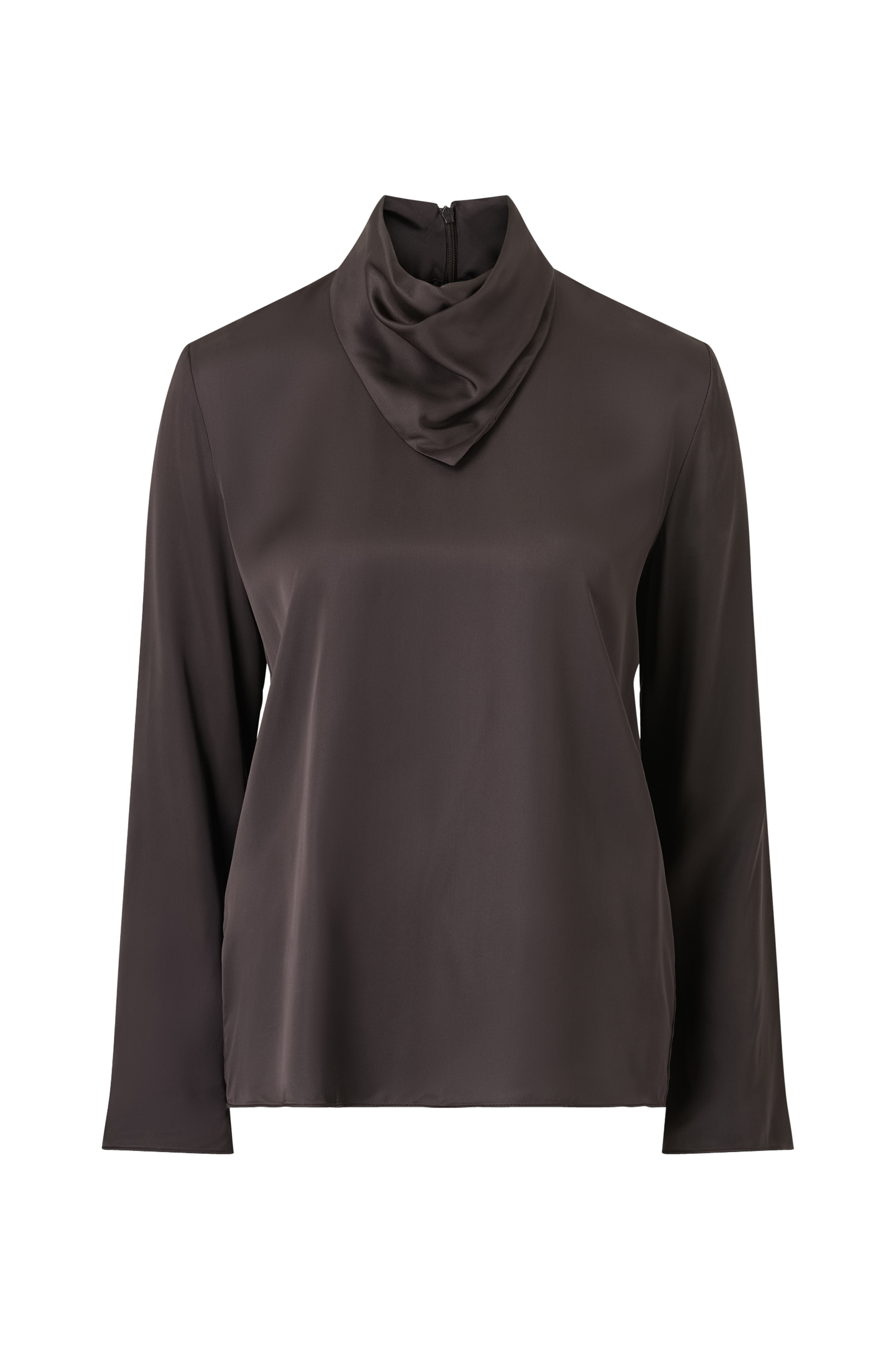 • Langermet bluse i sateng• Skjerfkrage med knappelukking i nakken• Skjult glidelås i ryggen