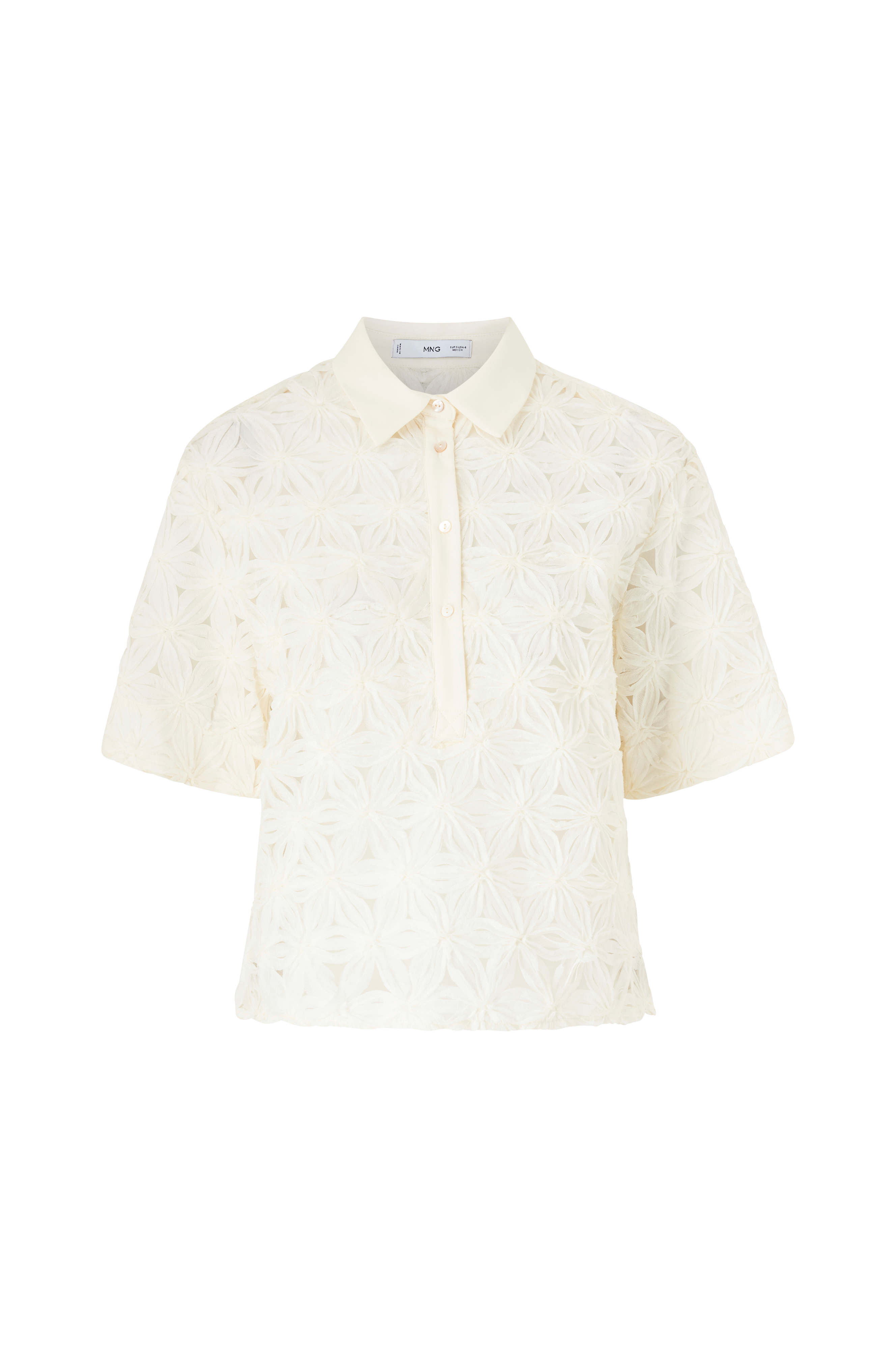 • Modell i mesh med blomstret applique overalt• Liten krage• Kort frontknepping• Kort erme