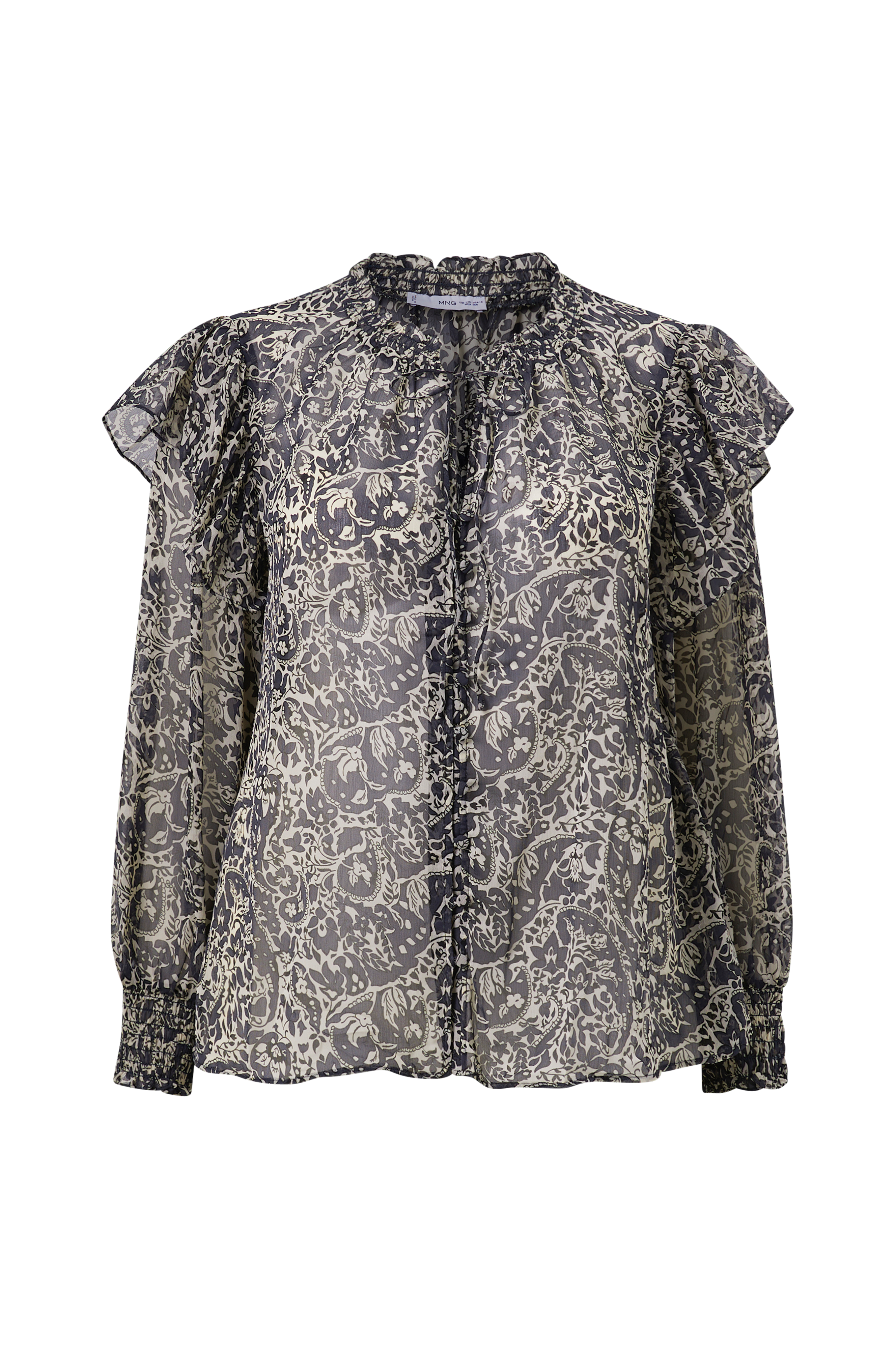 • Bluse i gjennomsiktig chiffon• Knapper foran• Vaffelsøm i halsen• Ventilasjon med knytbar tråd foran• Ballongermer med vaffelsøm i ermeslutten• Volang på skuldrene• Plusstørrelser