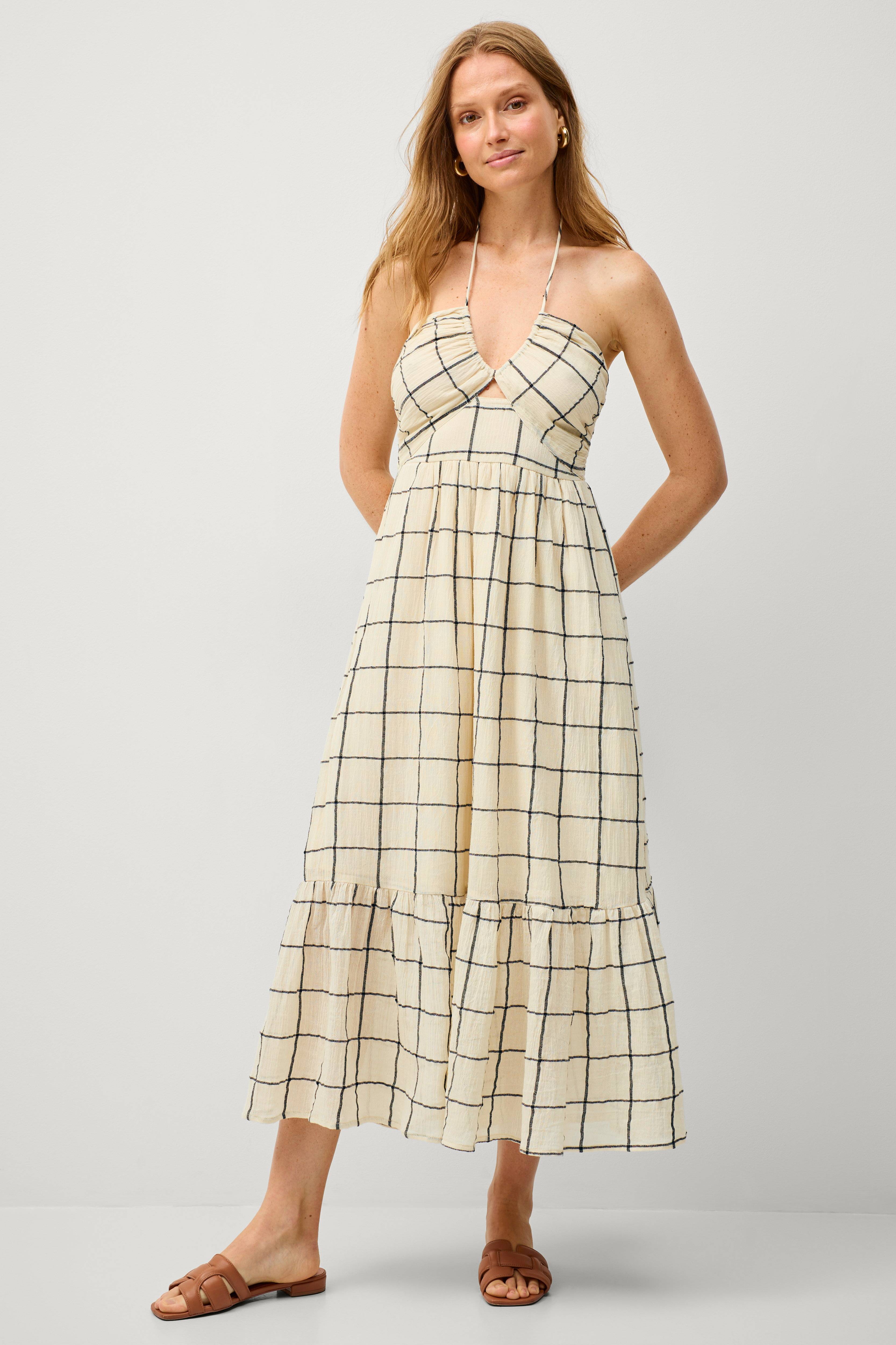 • Lang modell i krepp med knytbar tråd i nakken• Bred, elastisk vaffelsøm oppover ryggen• Definert midje• Utsvingt skjørt med volang på bunnen• Fôret• Lengde bak 107 cm i størrelse S